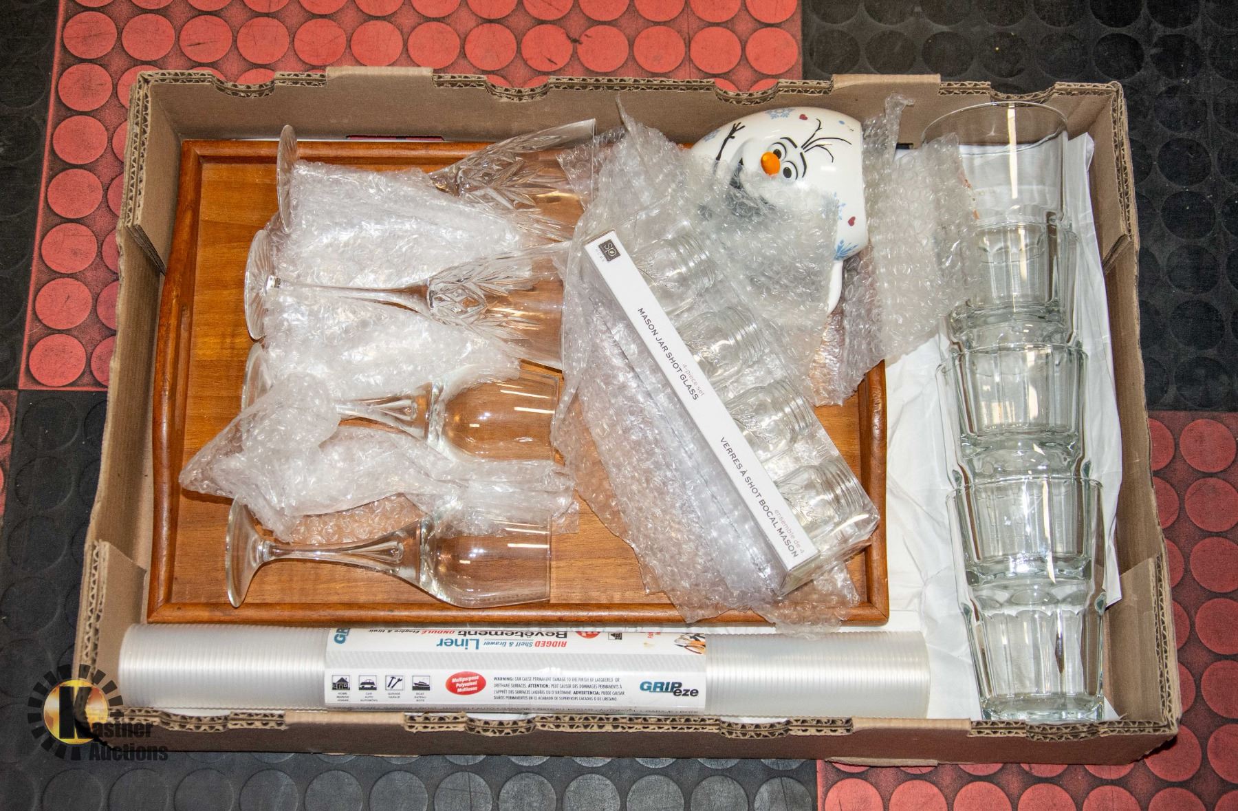 NEW MASON JAR SHOT GLASS SET, 4 CRYSTAL WINE/APERITIF GLASSES, WOODEN TRAY, NEW ROLL OF RIDGED SHELF & DRAWER LINER, OLAF COFFEE/HOT CHOCOLATE CUP, ETC.