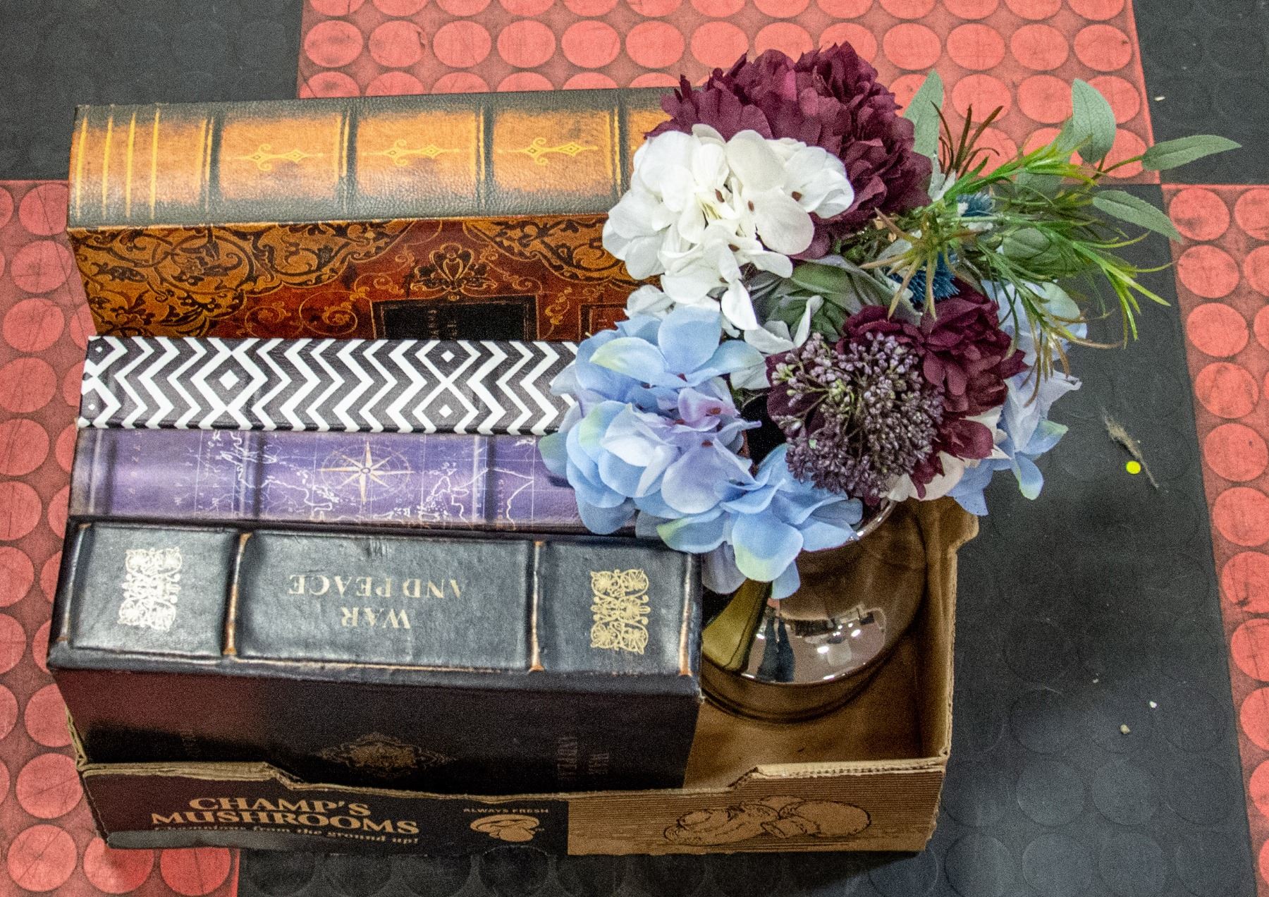 FLAT WITH SILVER COLOURED DECOR, BOOK BOXES + MORE