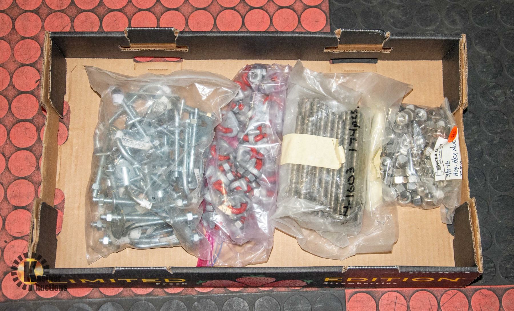 BAG OF CABLE CLAMPS, 174 PIECES OF 3/8"-THREADED READY RODS, BAG OF 3/8" NUTS, BAG OF MUFFLER CLAMPS/PIPE CLAMPS, HUNDREDS OF ITEMS