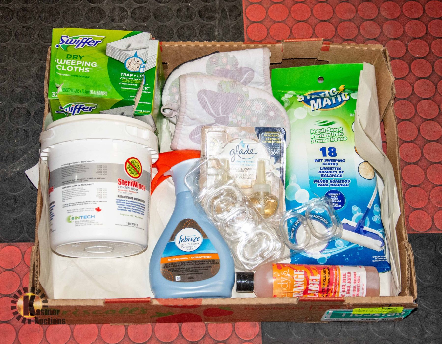 BOTTLE OF NATURAL CITRUS CLEANER, FEBREEZE, GLADE, OPEN BOX OF SWIFFER DRY SWEEPING CLOTHS, STERIWIPES, ETC. **SHIPPING NOT AVAILABLE** **ALL ITEMS MUST BE REMOVED BY 5PM SATURDAY, JUNE 1ST 2024. ALL REMAINING ITEMS WILL BE SUBJECT TO A $6.00 PER DAY STORAGE CHARGE. ANY ITEMS REMAINING AFTER MONDAY, JUNE 17TH 2024 WILL BE CONSIDERED FORFEITED. NO REFUNDS WILL BE ISSUED FOR FORFEITED ITEMS. TO SCHEDULE A PICK UP APPOINTMENT CLICK HERE