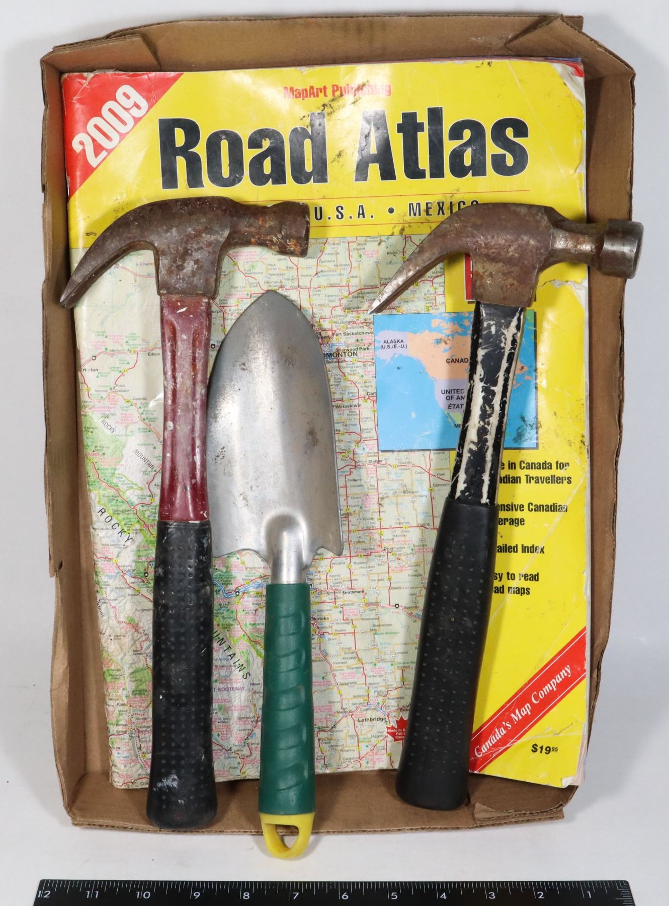 FLAT WITH TWO HAMMERS, GARDEN TROWEL, AND