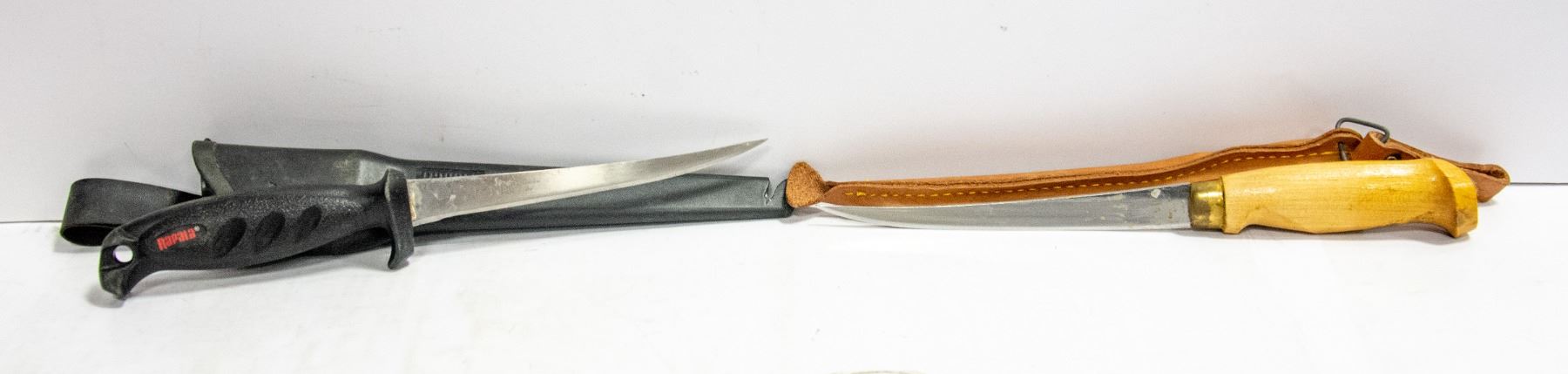 J. MARTTINI-FINLAND IN LEATHER BELT SHEATH AND A BLACK RAPALA IN BELT SHEATH WITH SHARPENER ON SHEATH