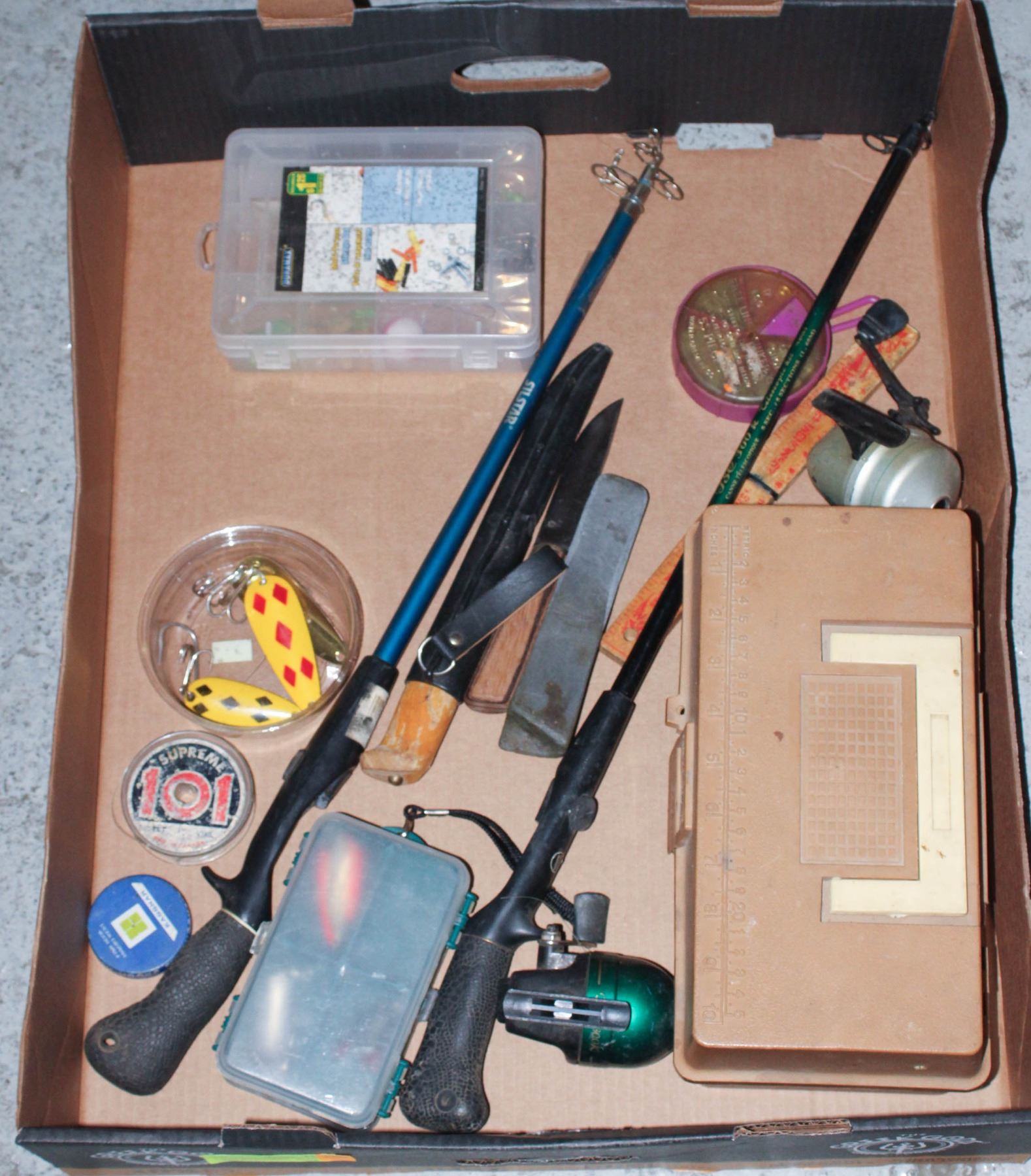 INCL. 2 TELESCOPE FISHING RODS, 3 VARIOUS FISHING KNIVES WITH HONING STONE, TACKLE BOX AND 2 TACKLE SORTING CONTAINERS, INCLUDING TACKLE, WEIGHTS, LURES, REELS, PLIERS, FLOATS, ETC.