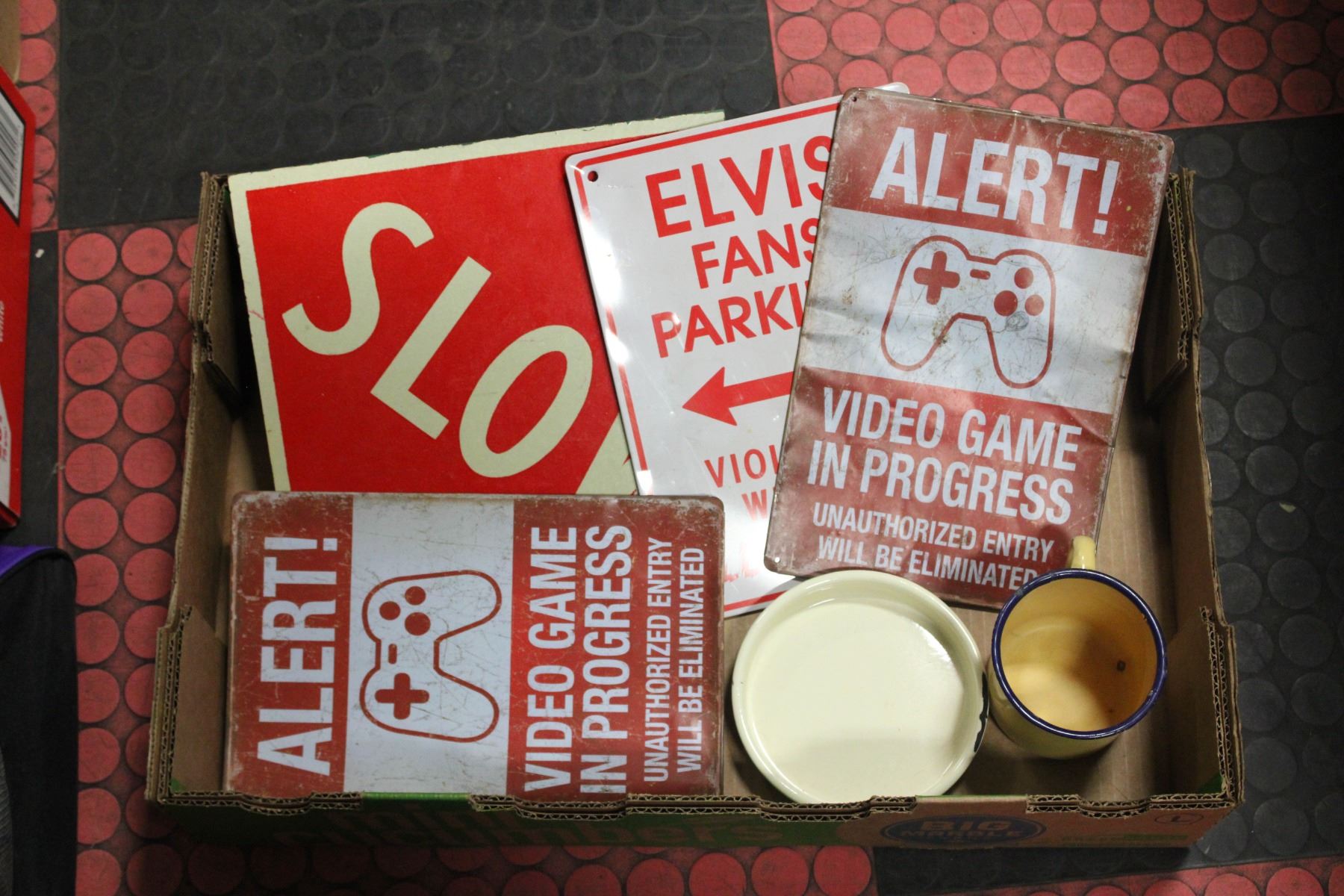 4 METAL SIGNS, ENAMELLED TIN BOWL AND CUP **ALL ITEMS MUST BE REMOVED BY 5PM SATURDAY, APRIL 5TH 2025. ALL REMAINING ITEMS WILL BE SUBJECT TO A $6.00 PER DAY STORAGE CHARGE. ANY ITEMS REMAINING AFTER MONDAY, APRIL 21ST 2025 WILL BE CONSIDERED FORFEITED. NO REFUNDS WILL BE ISSUED FOR FORFEITED ITEMS. TO SCHEDULE A PICK UP APPOINTMENT CLICK HERE