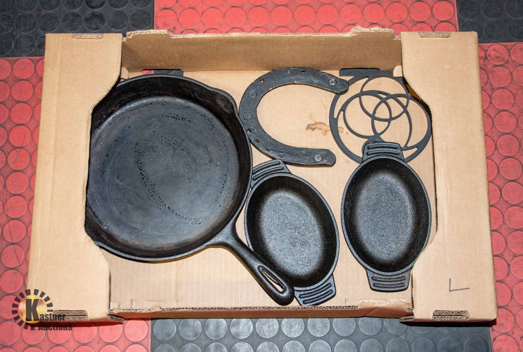 NO. 9" CAST IRON PAN (FLAT - NO CRACKS OR REPAIRS, MADE IN CANADA - CARLTON PLACE ONT.) PLUS 2 CAST IRON OVAL PANS, LARGE CAST IRON HORSE SHOE PAN-REST AND SILICON PAN REST
