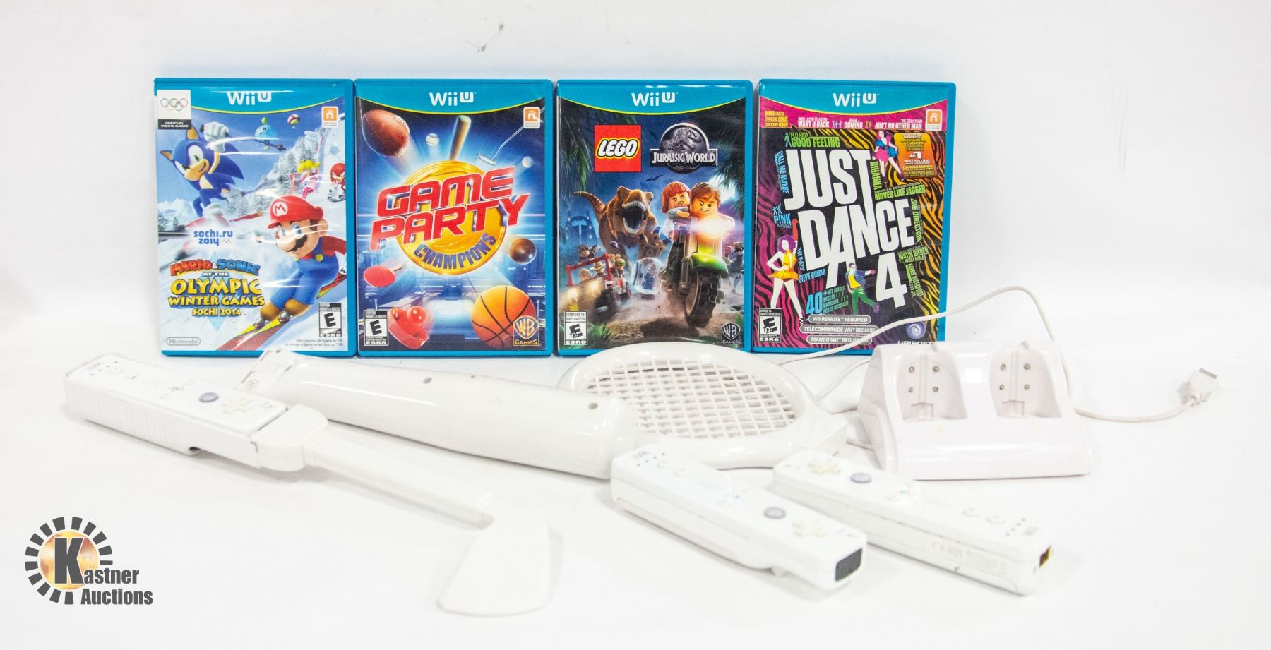 FOUR WII-U GAMES - MARIO AND SONIC, LEGO JURASSIC WORLD, GAME PARTY CHAMPIONS, AND JUST DANCE - INCLUDES 3 WII REMOTE CONTROLLERS, PEDESTAL DOUBLE CHARGER, TENNIS, GOLF AND BASEBALL ACCESSORIES SET **ALL ITEMS MUST BE REMOVED BY 5PM SATURDAY, DECEMBER 16TH 2023. ALL REMAINING ITEMS WILL BE SUBJECT TO A $6.00 PER DAY STORAGE CHARGE. ANY ITEMS REMAINING AFTER TUESDAY, JANUARY 2ND 2023 WILL BE CONSIDERED FORFEITED. NO REFUNDS WILL BE ISSUED FOR FORFEITED ITEMS. TO SCHEDULE A PICK UP APPOINTMENT CLICK HERE