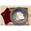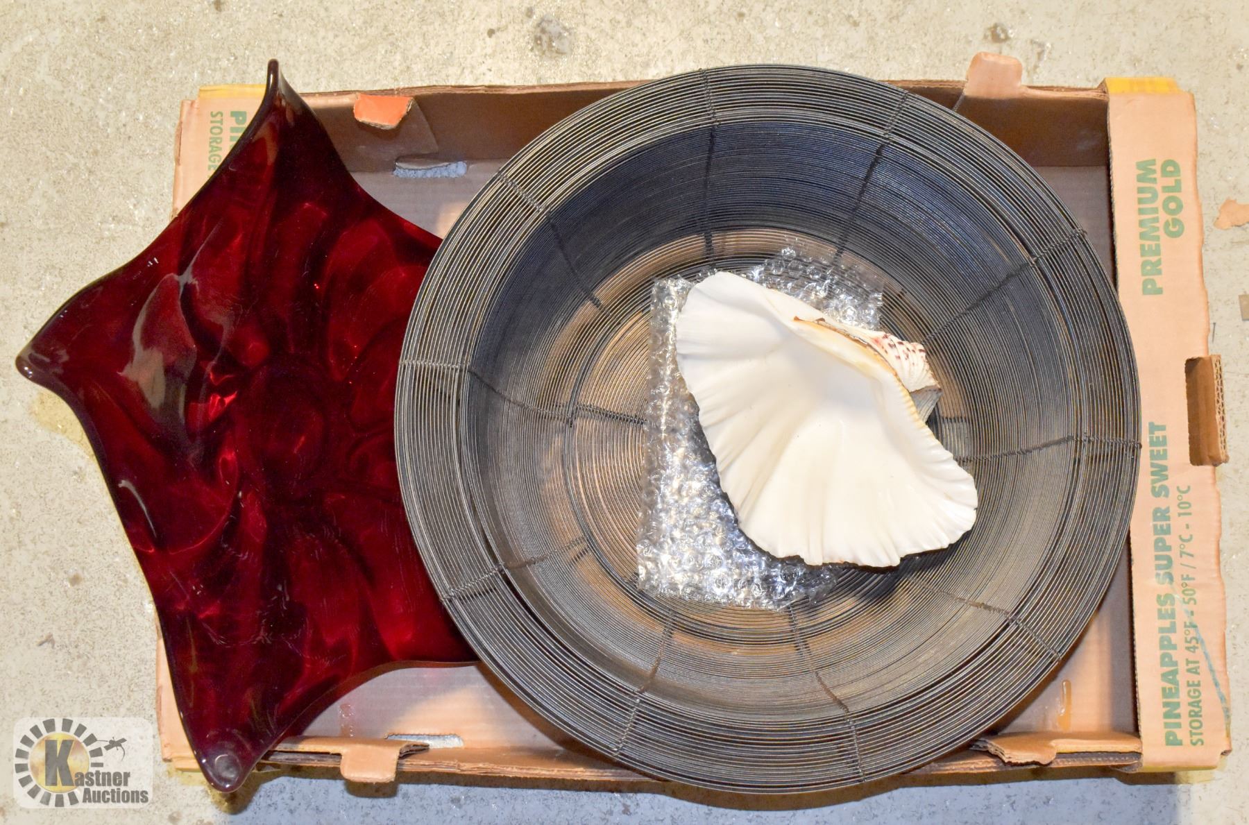 FLAT WITH WIRE BASKET, RED GLASS, SEASHELL