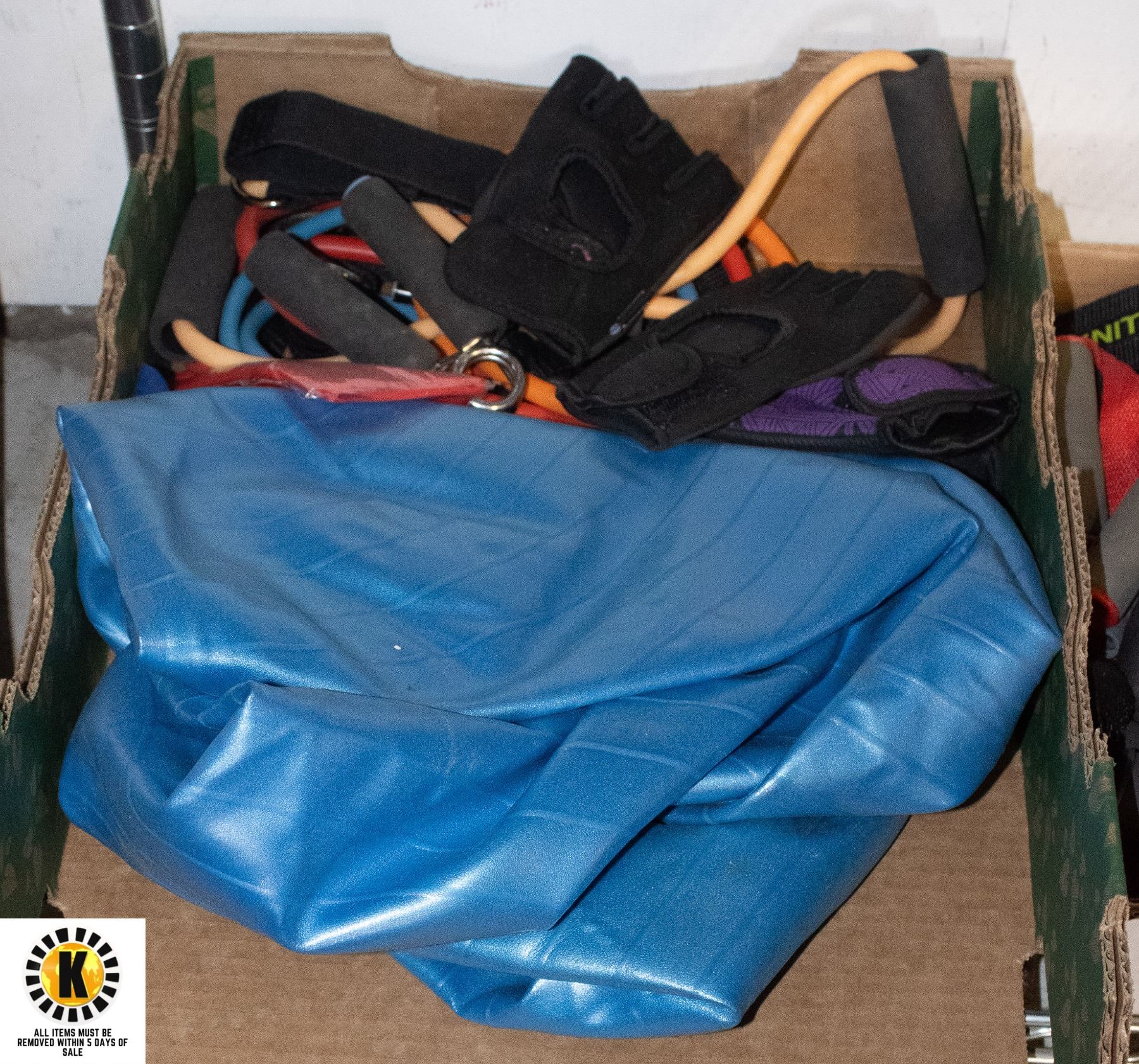 FLAT WITH YOGA BALL, WORK OUT GLOVES, AND