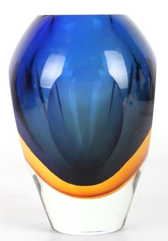 Flavio Poli Murano cobalt blue & yellow sommerso glass vase made in Italy during the 1950's