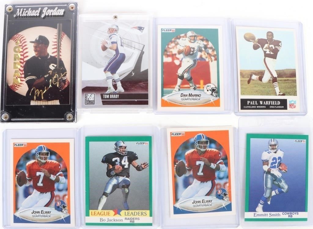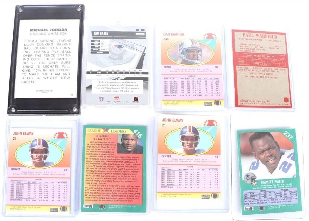 To include: 1965 Topps Football Paul Warfield, 1990 Fleer Dan Marino, (2) 1990 Fleer John Elway, 1991 Fleer Emmitt Smith, 1991 Fleer League Leaders Bo Jackson, 1995 Sports Stars USA Baseball Michael Jordan, & 2006 Donruss Elite Tom Brady.