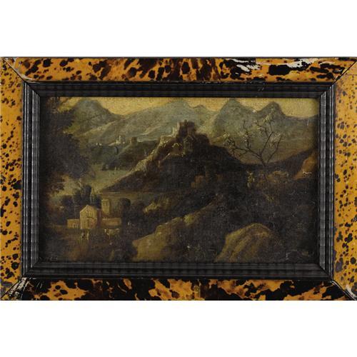 <B>FLEMISH SCHOOL</B></I> (Eighteenth Century)<BR><I>Landscape With Village,</B></I><BR>Oil on canvas<BR>10-1/2 x 16-1/2 inches (22.5 x 35.3 cm)<BR>Unsigned <B>Condition Report:</B> Normal signs of wear as appropriate with age with severe craquelure, losses to canvas at corners, pino holes to top of canvas, .25 inch tear to canvas center left canvas.<BR><BR><b>Shipping:</b> Requires 3rd Party Shipping (<a target="_blank" href="http://www.heritageauctions.com/common/shipping.php">view shipping information</a>) <BR><BR><B>Imp