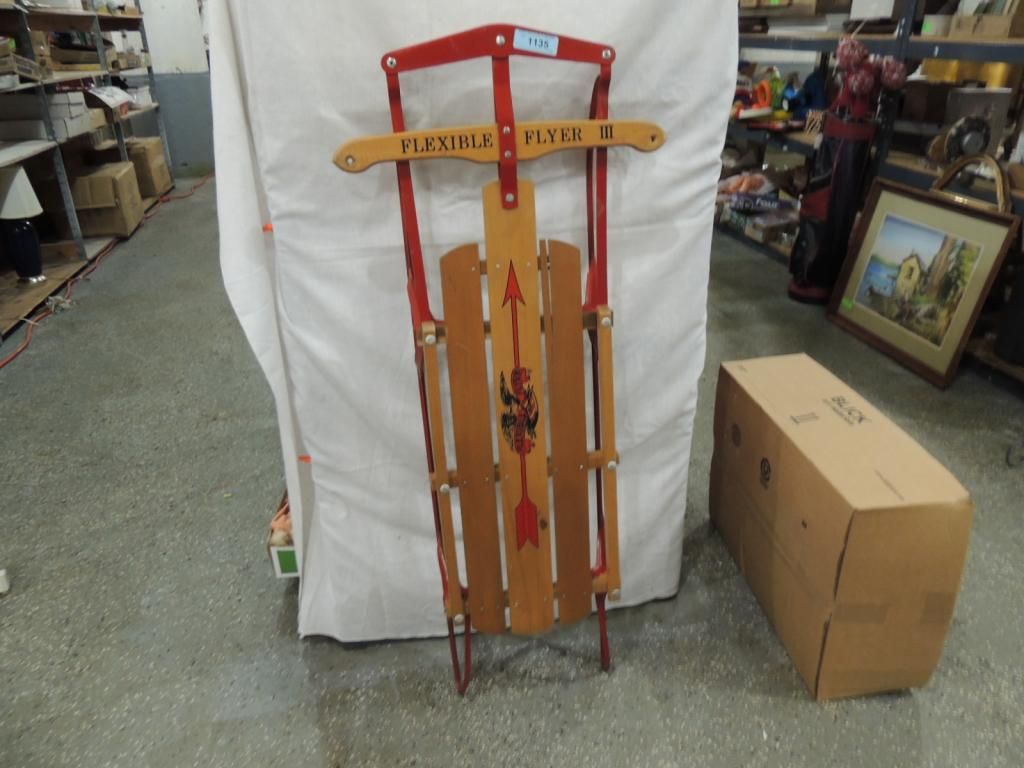 FLEXIBLE FLYER 3 ANTIQUE STYLE SLED. STEER WOODEN SLED. BOTTOM WOOD CRACKED IN MIDDLE. METAL FRAME. AS SHOWN. SEE PHOTO FOR MORE DETAILS