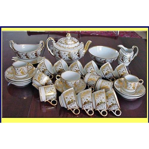 The decoration on this set is all done in gold and consists of acorns and oak leaves and twigs. Understated elegance at it's finest. The teapot has a wonderful concave fluting on both the neck and the bottom of the spout, a narrowed, oval form and strawberry finial. Graceful, curving handles, rich gilding with subtle shading.