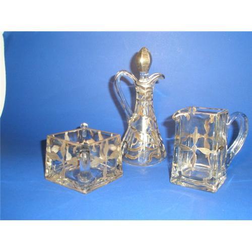 WE PRESENT TO YOU A VERY RARE THREE PIECE SET WITH STERLING SILVER OVERLAY, SHOWING A CRUET, A CREAMER, AND A SUGAR BOWL. ALL THREE ARE HANDLED AND THE CRUET HAS A STOPPER. THE SUGAR BOWL HAS TWO HANDLES,AND LIKE THE CREAMER IS AN OFFSET SQUARE FORMING A DIAMOND, WITH THE HANDLES ON EACH END. THE CREAMER, MATCHING THE SUGAR BOWL, HAS ONE HANDLE OFFSET ON ONE SIDE AND THE POUR SPOUT ONE THE OTHER SIDE. THE CRUET IS OCTAGON SHAPED ON THE BASE AND THE STOPPER HAS A HEXAGON SHAPE WHICH COMES TO A POINT. THE CRUET IS 6.5"TALL AND 3.0" AT THE BASE, THE CREAMER IS 4.0"TALL AND 2.25" AT THE BASE AND THE SUGAR BOWL IS 2.25" TALL AND 2.75" AT THE BASE. ALL THREE PIECES ARE IN EXCELLENT CONDITION, WE HAVE OVER 5000 PIECES OF COLLECTIBLE GLASS ALL OF WHICH WILL BE FOR SALE AND WE HAVE NEVER SEEN A SET LIKE THIS BEFORE. THEY WONT LAST AT THIS PRICE, TRULY A COLLECTORS DREAM. FLOURECES APPLE GREEN.