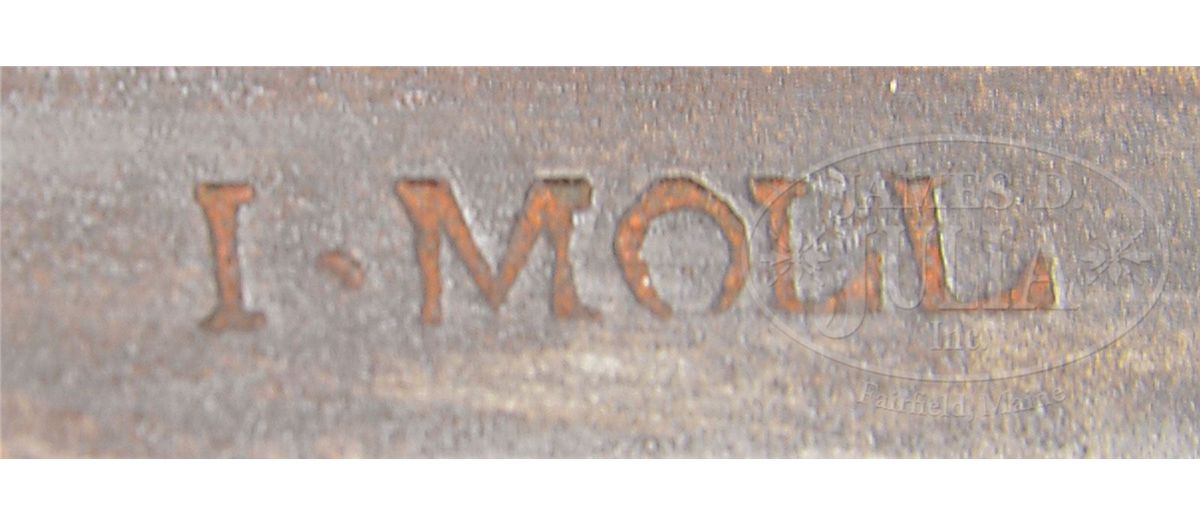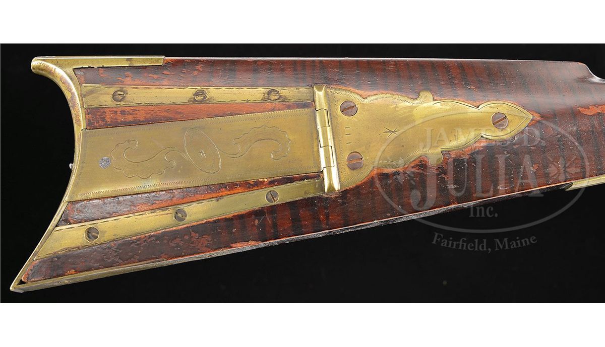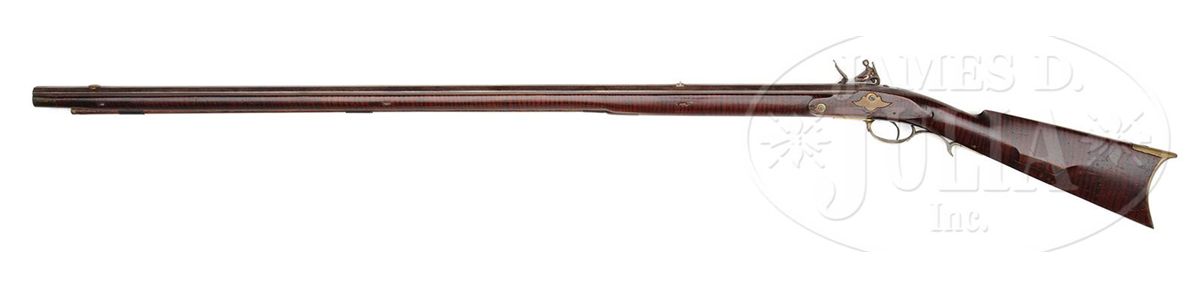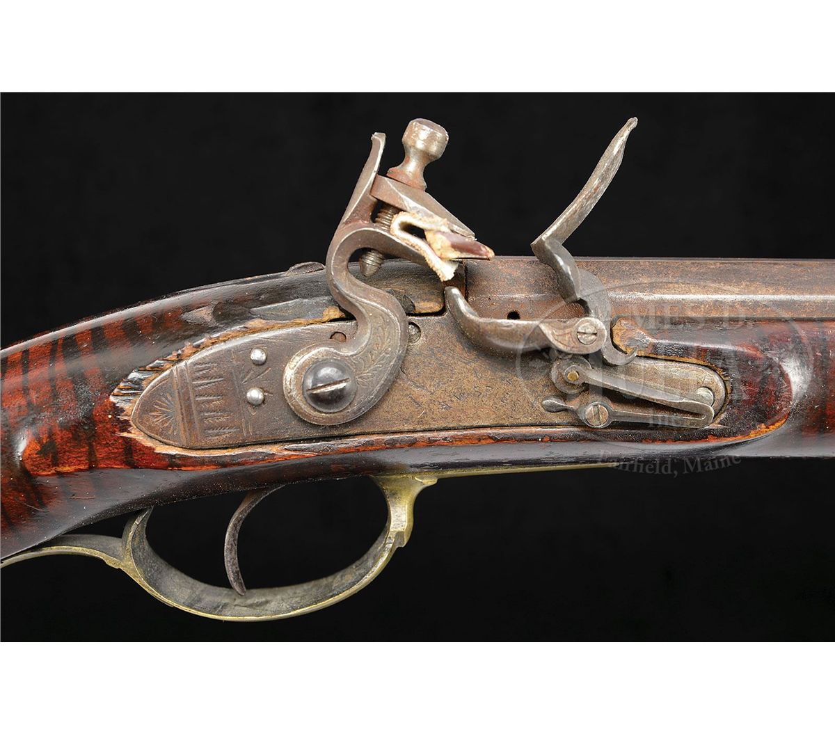 NSN. Cal. .52 smoothbore. Rifle has a 42" full oct bbl marked “I. Moll”. John Moll III purchased the family gunsmithing business from his father John Moll II in 1820 and remained with the business until his death in 1883. Rifle has the typical 4-piece brass patchbox with the expected Moll style engraving. Smooth rifle has a hand striped stock normally found on rifles made by the Hellerstown Molls’. Flintlock is marked “A.W. Spies”. PROVENANCE: Collection of Woody Frey. CONDITION: Rifle is in very good condition throughout. 4-48493 RG10