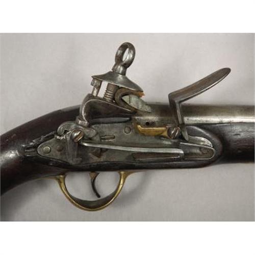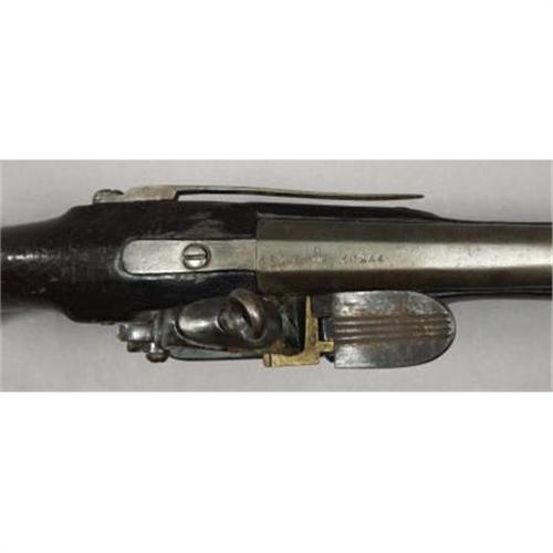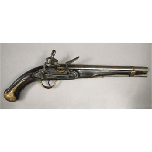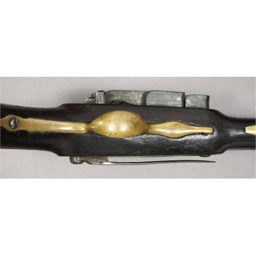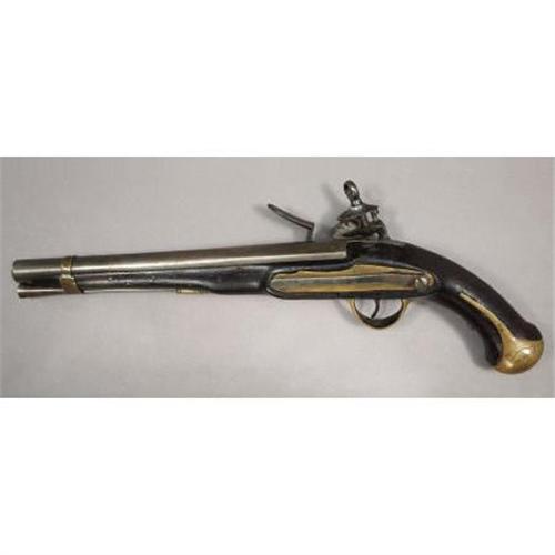 <B>FLINTLOCK PISTOL</B></I> - Early example of large bore pirate style sidearm of European manufacture. 12” octagon to round .70 calibre smooth bore barrel stamped on top at breach 1820, 10246 with an 'O' over an 'M.' Left barrel flat stamped 'EX'-'GA'. Miquelet style lock plate is very interesting employing a relatively unique half and full cock system that protrudes from the lock plate to engage an external hammer notch. Fully brass mounted with iron belt hook. Iron lock plate stamped with a large 'P' and the same 'GA' as the barrel. Functioning action with full length wood stock. <BR><BR><B>Condition:</B></I> Wood stock may have been shortened a bit. Brass barrel band an old replacement. Iron ramrod is a replacement. Wood stock shows good honest age but evidences numerous wood replacements along side of barrel. Lock escutcheon and belt hook are replacement. Original brass components have an honest old patina.<BR><BR><b>Shipping:</b> Bats, Clubs, Sticks, Swords, Rif (<a target="_blank" href="http://www.heritageauctions.com/common/shipping.php">view shipping information</a>)