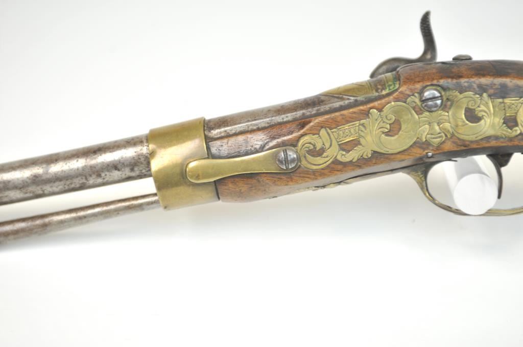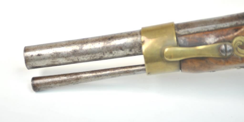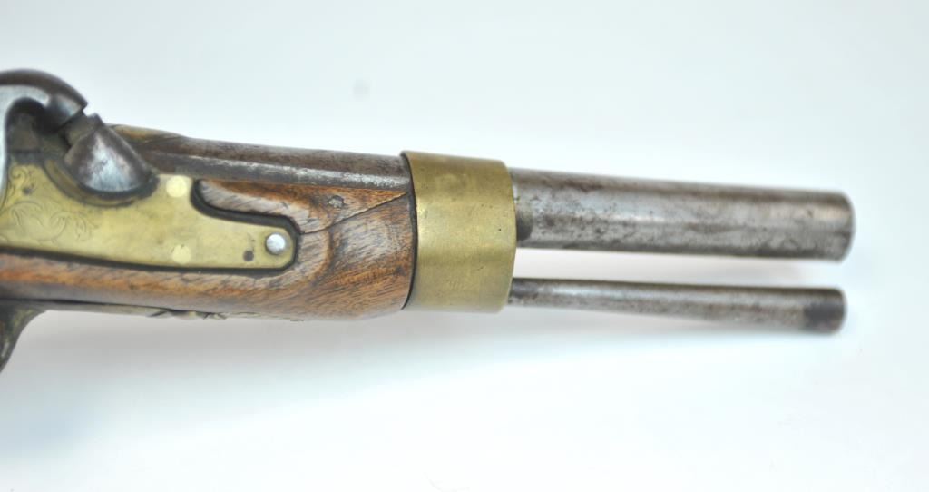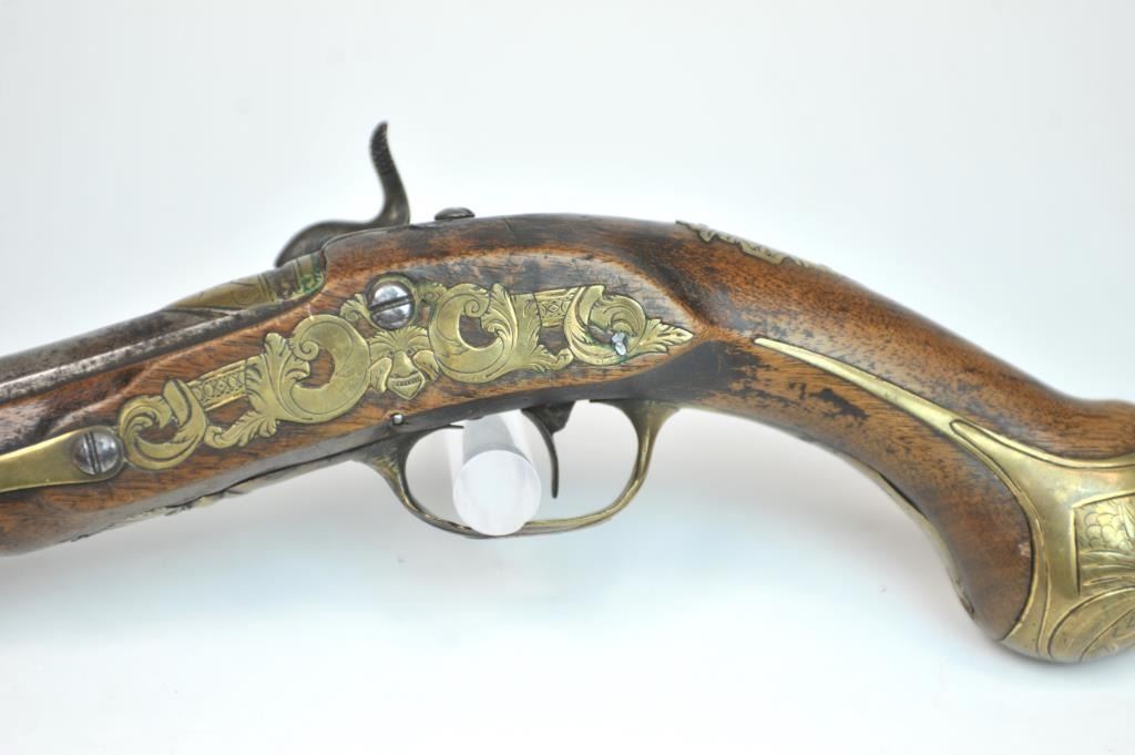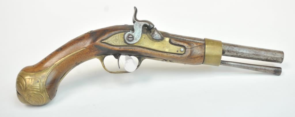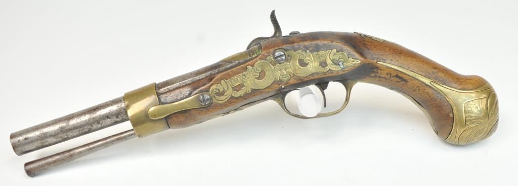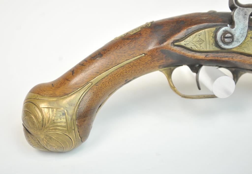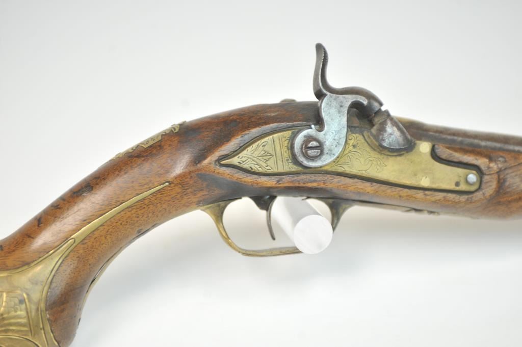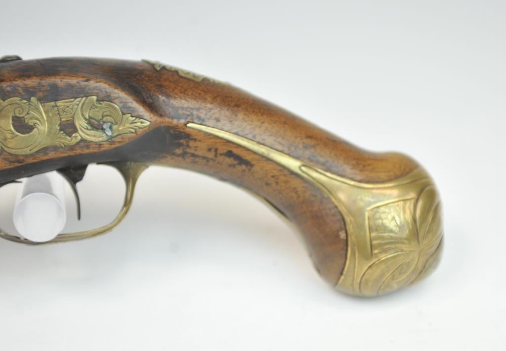 18th century flintlock pistol converted from flintlock to percussion and shorted in the 19th century. Many faces in decoration and continental European manufacture. Measures 16” overall with an 8 ½” barrel of .60+ caliber smoothbore. Steel period ramrod included. Good action. Stock is good with some cracks and normal aging. (Antique) Est.: $250-$500