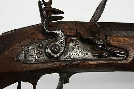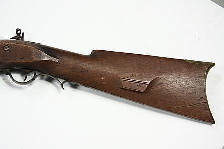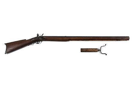 FLINTLOCK RIFLED MUSKET - Flintlock Rifled Musket with .80 cal octagonal 40IN barrel by Metcalf, set onto walnut stock with brass fittings, 56IN long overall, open sights, with shooting yoke.