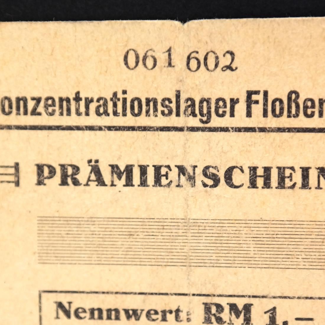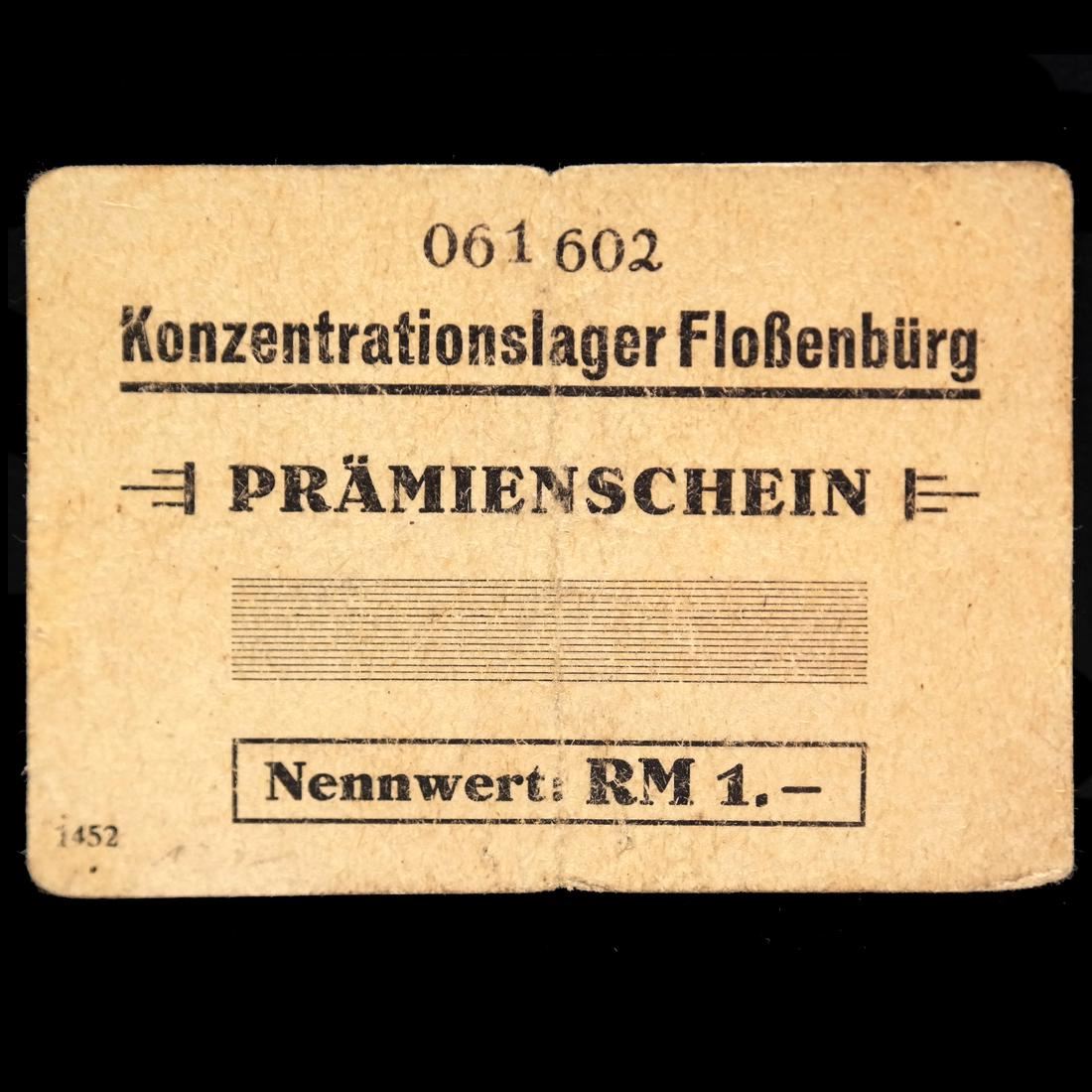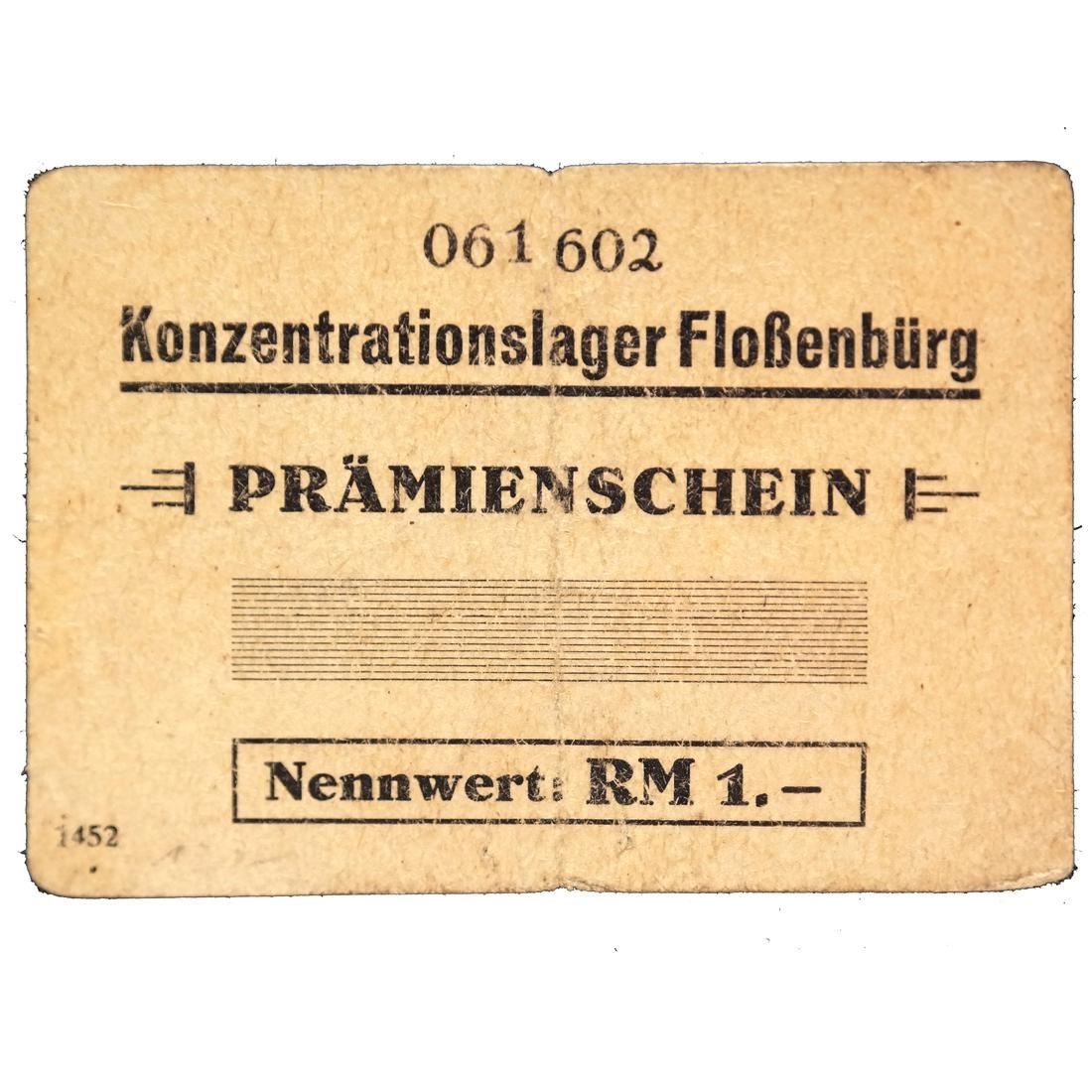 Konzentrationslager Floenbrg / Prmienschein / Nennwert: RM 1.- on cream card, serial #061602, measures approx 74 by 52mm, vertical center fold, creases, wrinkles, pinhole and soiling, Fine.