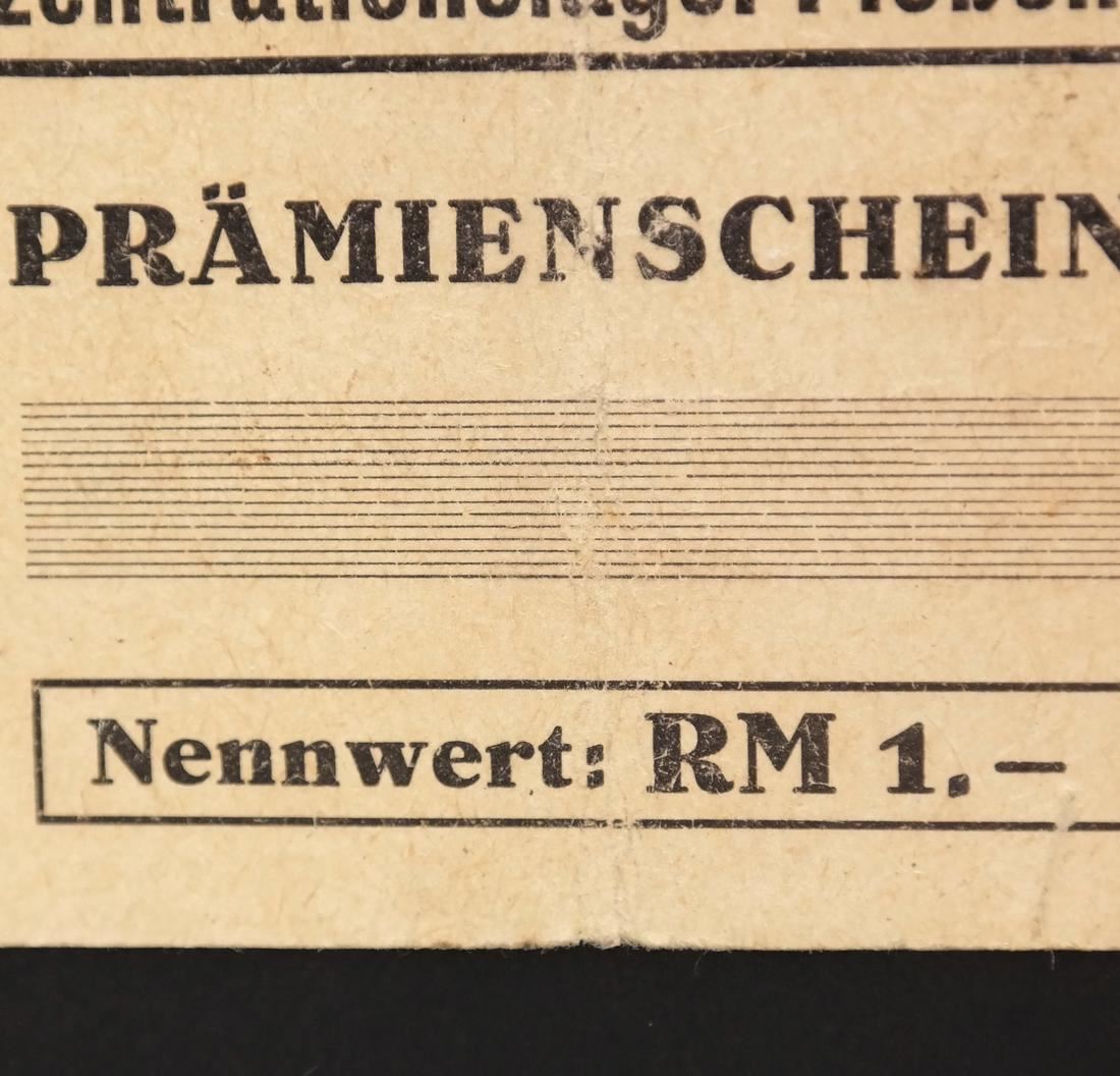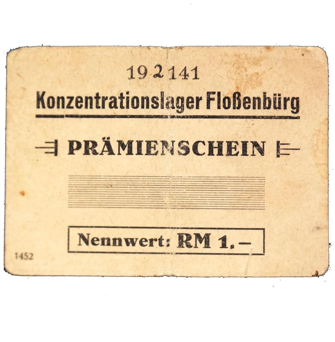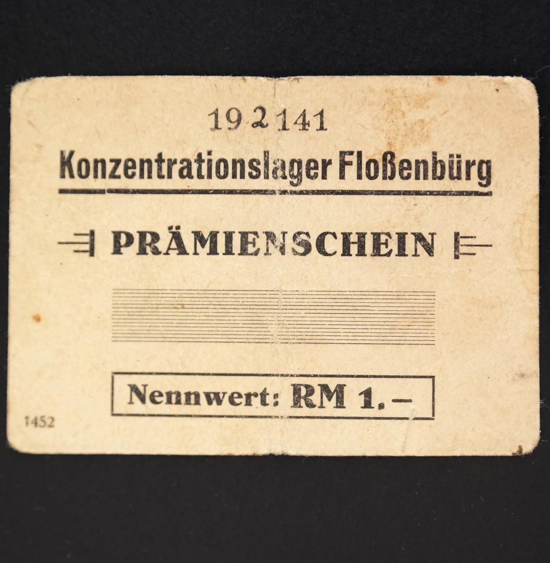 Konzentrationslager Floenbrg / Prmienschein / Nennwert: RM 1.- on cream card, serial #192141, measures approx 74 by 52mm, vertical center fold, wrinkles, small edge tear and light soiling, Fine.