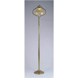 Lot 792 FLOOR LAMP WITH EUROPEAN ART GLASS SHADE Lamp begins with a European decorated art glass shade in the manner of Loetz. Shade is supported b a simple brass base. Unsigned. SIZE: Shade 2-1/4” fitter x 8” w. Overall height is 54”. CONDITION: Shade has minor chips to fitter rim. Base shows wear and replacement shade-holder. 5-70738