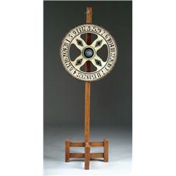 FLOOR MODEL GAMBLING WHEEL. Two sided gambling wheel complete with base. SIZE: 67” h. CONDITION: Generally good. PF 1-3601 (150-250)