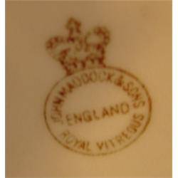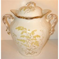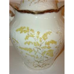 FLORAL & GILT DECORATED PITCHER & DOUBLE-HANDLED POT. Decorated with yellow floral decoration around body and gilt decoration around edge and on handles. Marked on bottom "John Maddock & Sons Ltd-Royal Vitreous-England". Minor loss to gilt on both. Double handled pot has a crack and chip at top edge. Pitcher: 11" H, Pot: 13.75" H