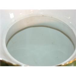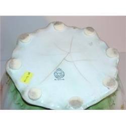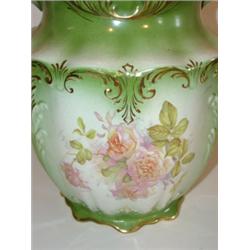 FLORAL DECORATED DOUBLE HANDLED URN WITH LID. Gilt decoration. Marked on bottom "Semi-Vitreous Porcelain-W.F & N Co." Spider cracking is visible on underside of bottom and inside of bottom. Crack is also visible on body from inside. 13.5" H