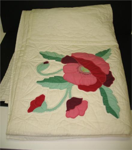 FLORAL DECORATED AMERICAN QUILT. Decorated with red flowers on cream background. Shows some small signs of staining.