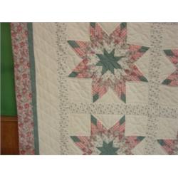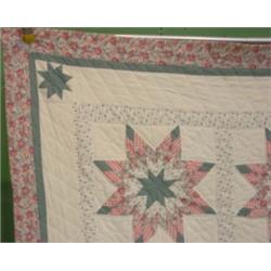 FLORAL DECORATED STAR PATTERN SUMMERTIME QUILT. Some staining is visible.