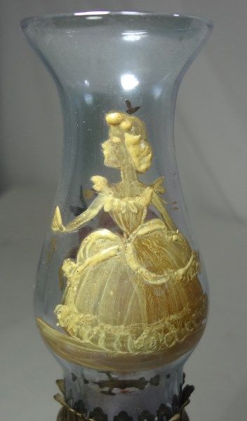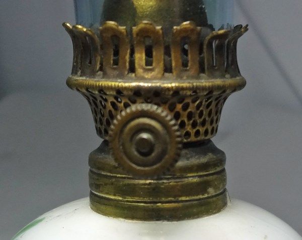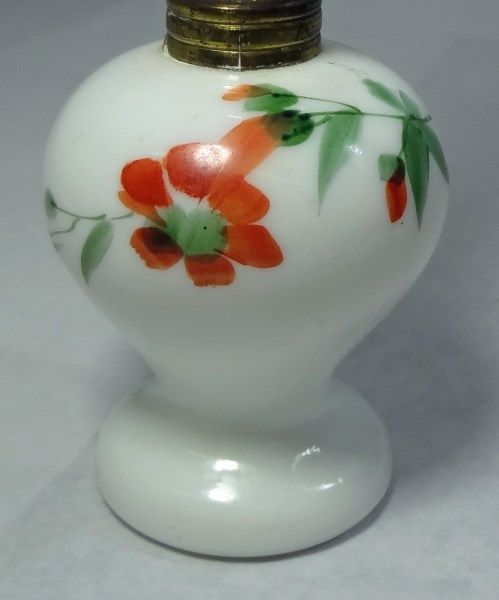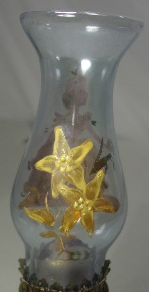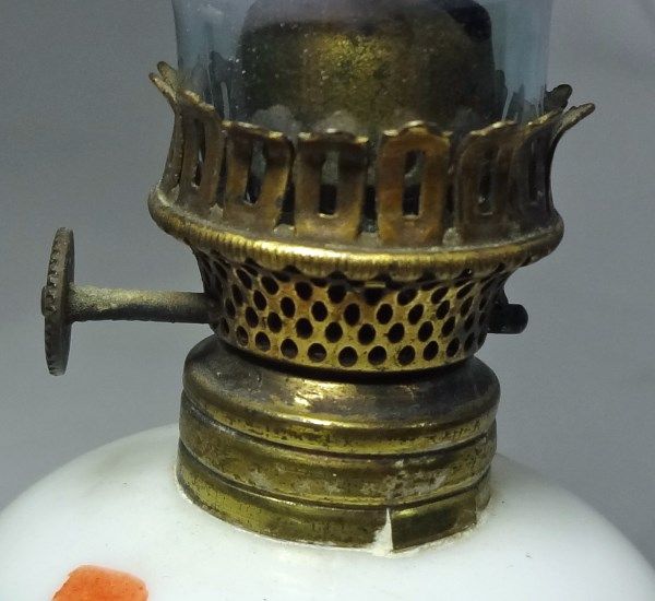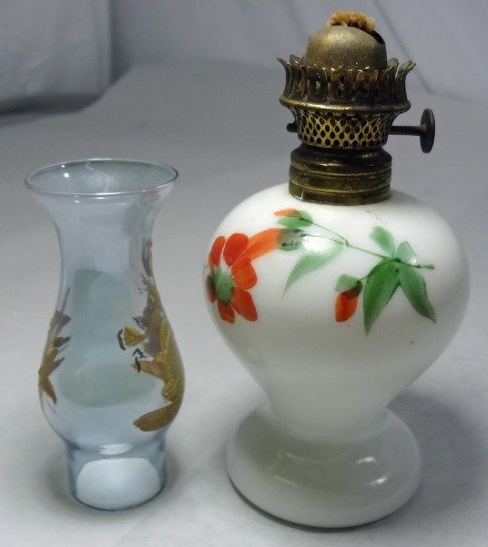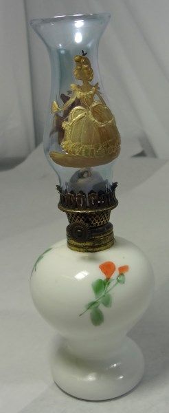 FLORAL MILK GLASS MINIATURE OIL LAMP WITH HAND PAINTED PRINCESS AND FLOWERS ON THE HURRICANE