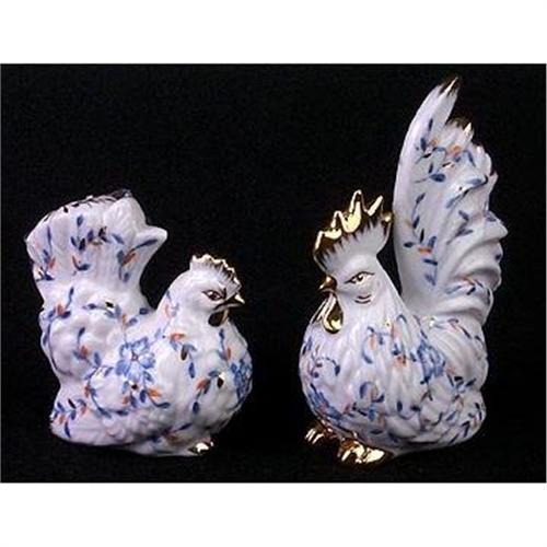 Brand new, Porcelain rooster and hen pair. Blue floral design on white with gilt accents. Dimensions: 5"h,3.5"w,2"d