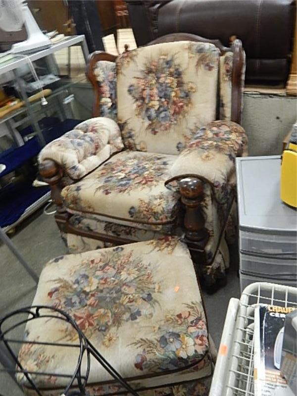 FLORAL & WOOD ARM CHAIR & OTTOMAN