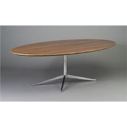 FLORENCE KNOLL for KNOLL oval dining/conference table with oval walnut veneer top on chrome pedestal base. Unmarked. 28" x 96" x 53" $1,000 - 1,500