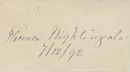 (1820 - 1910) English nurse and hospital reformer, she headed a team of nurses in the Crimean War, and later founded the first institution for the training of nurses. Beautiful bold signature on a small sheet adding "7/12/92". The tiniest of mounting traces to verso corners, otherwise near fine condition and ideal for display.
