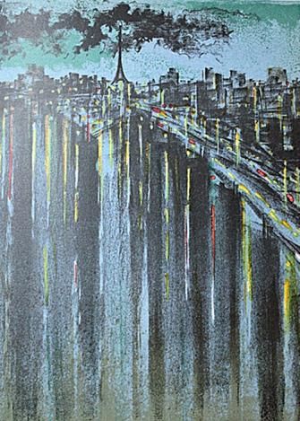 RICHARD FLORSHEIM - ORIGINAL LITHOGRAPH - "LA SEINE A PARIS" - ON VELIN D' ARCHES WOVE PAPER - PRINTED IN 1964 BY THE LEGENDARY ATELIER FERNAND MOURLOT, MOURLOT FRERES, PARIS FRANCE - ISSUED IN A LIMITED EDITION OF 2000 - NOT SIGNED - SHEET SIZE: 10" X 7 1/2" (255 X 185 MM) - PROFESSIONALLY FRAMED AND MATTED - THIS FLORSHEIM ORIGINAL LITHOGRAPH IS FROM THE SCARCE AND LAVISHLY-PRODUCED LIMITED EDITION CATALOGUE, "PRINTS FROM THE MOURLOT PRESS". PUBLISHED IN 1964 BY MOURLOT ON THE OCCASION OF THEIR LANDMARK TRAVELING EXHIBITION, WHICH WAS SPONSORED BY THE FRENCH EMBASSY AND THE SMITHSONIAN - THE CATALOG WAS LIMITED TO 2000 COPIES ON VELIN DE ARCHES WOVE PAPER AND 200 COPIES ON VELIN DE RIVES PAPER WHICH WERE RESERVED FOR THE ARTISTS