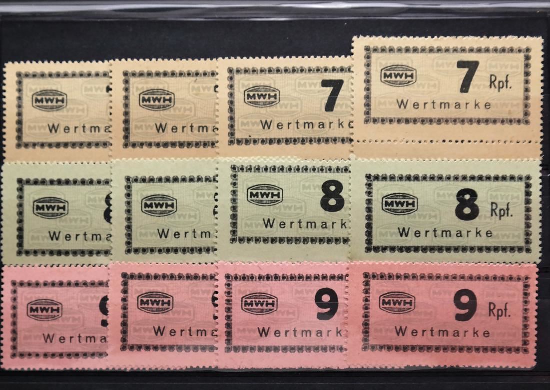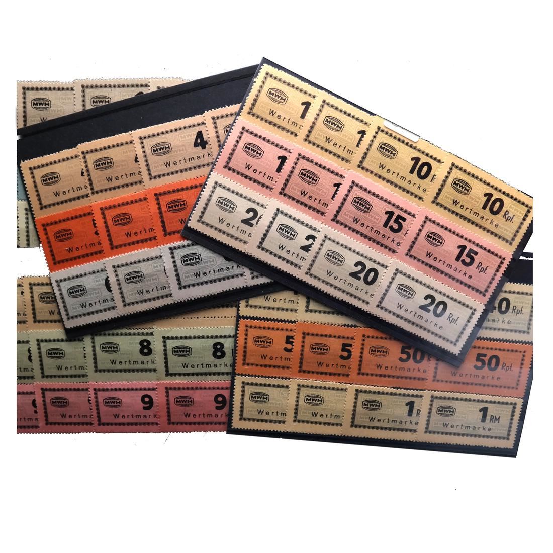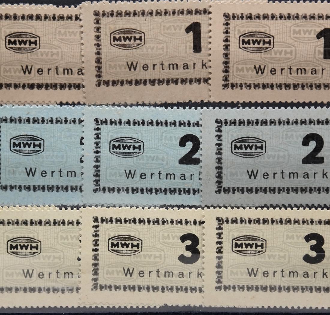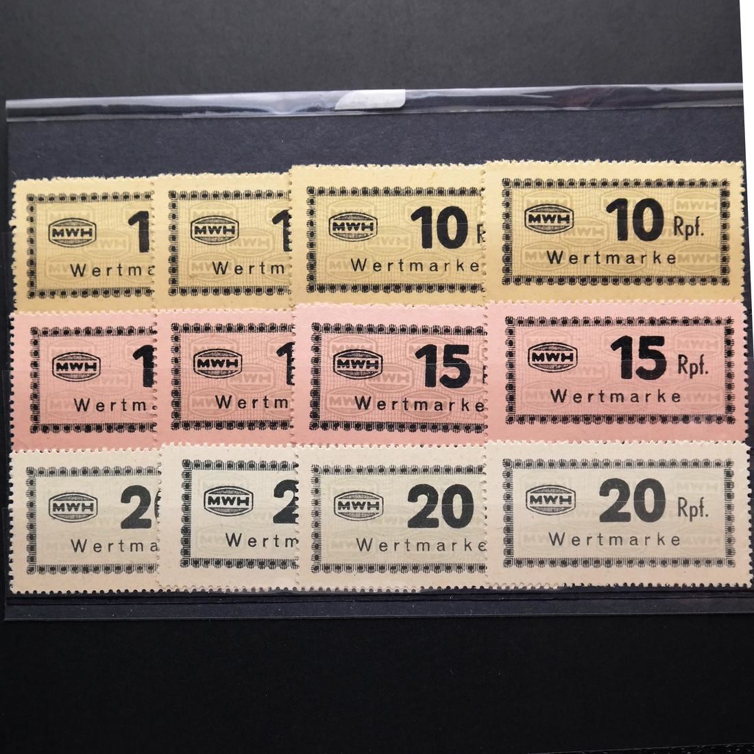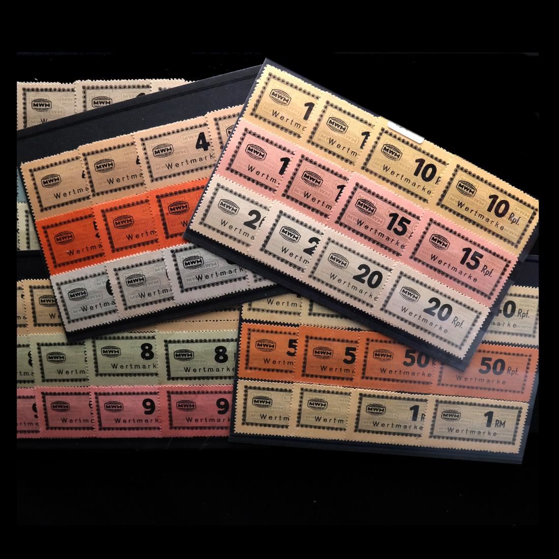Collection of all seventeen (17) different values of the Munitionsfabrik Und Waffen Hollschein (MWH) chits used at Flossenberg concentration camp, including the elusive 5RM (not known by Carl Siemsen), multiples of all values (except the 5RM) with shades, sound and VF-XF. (Accompanied by correspondence and cover from Carl Siemsen)