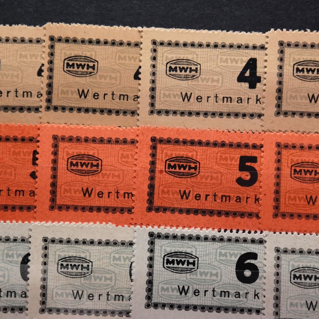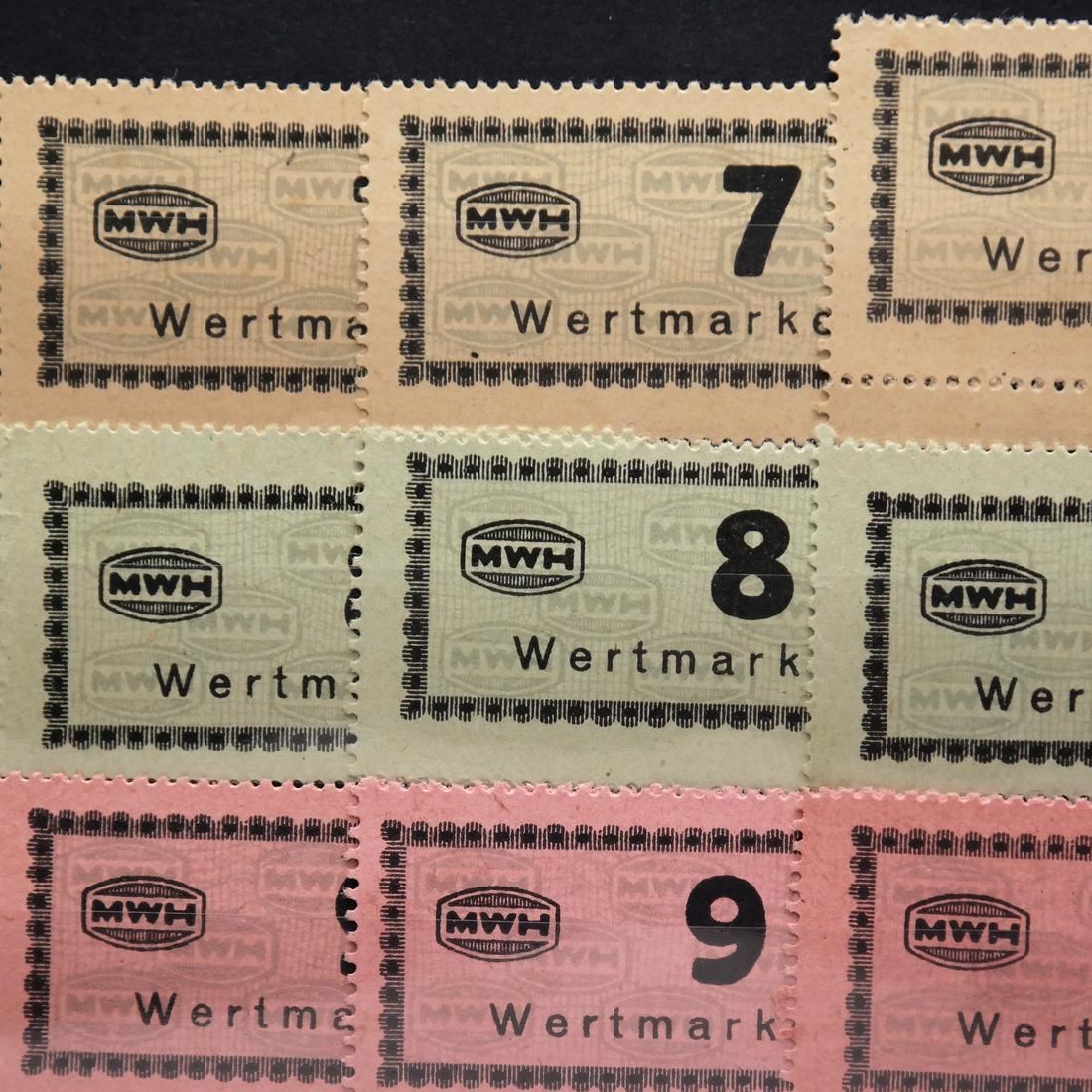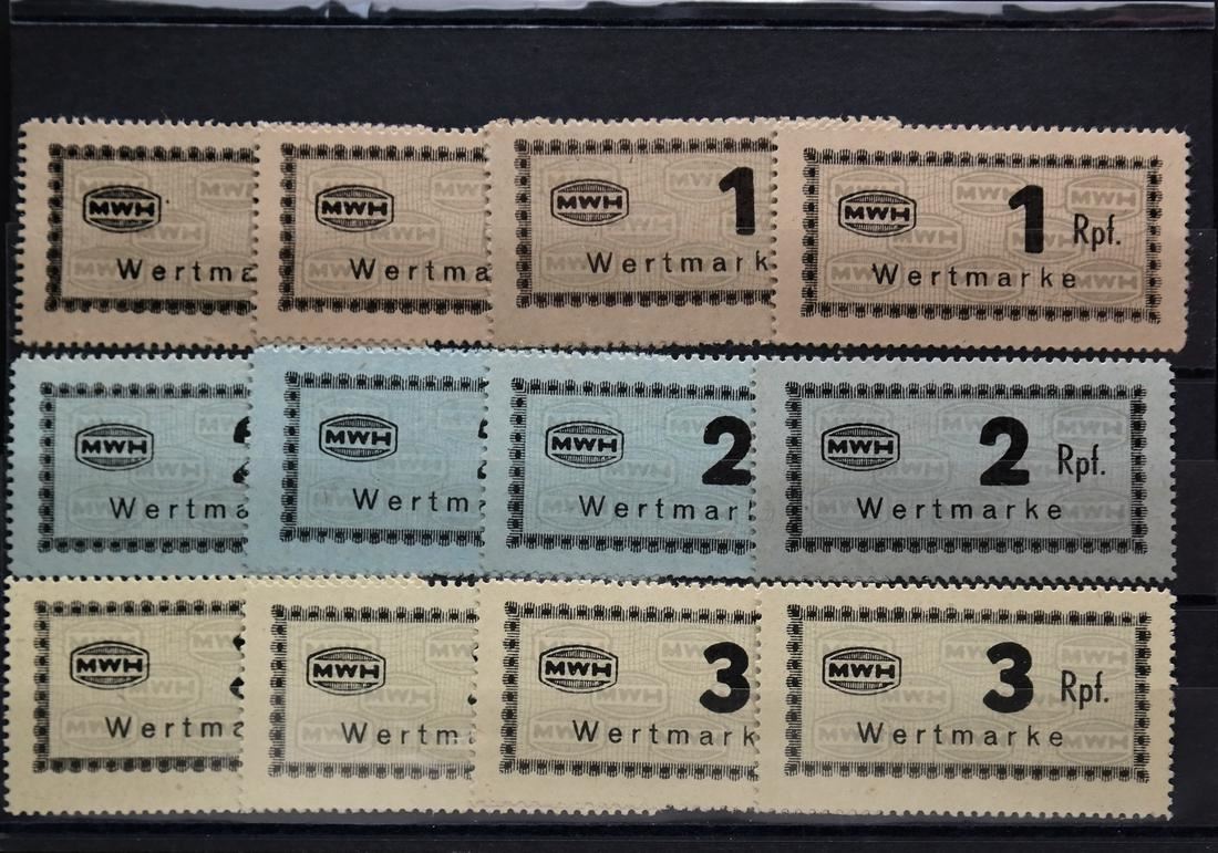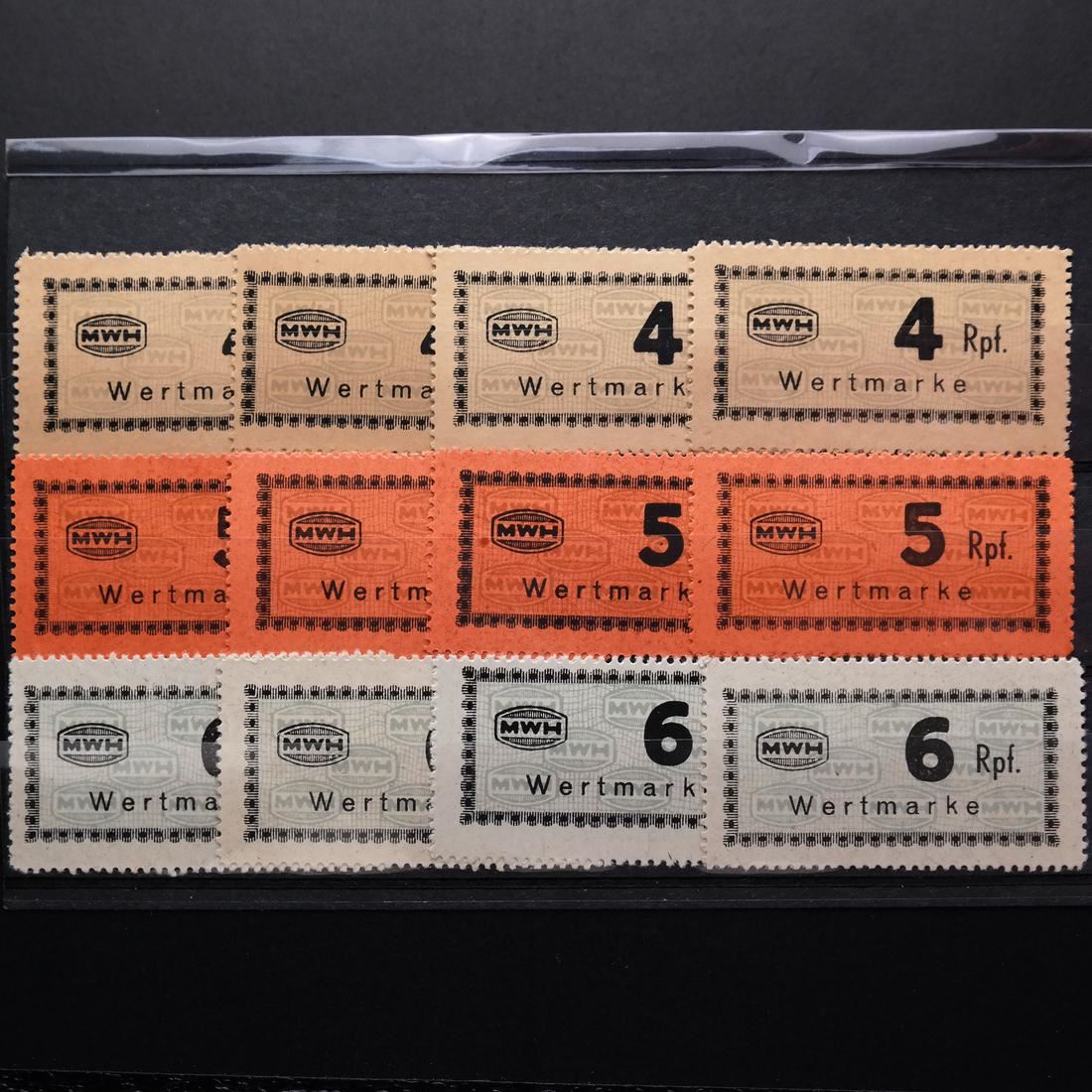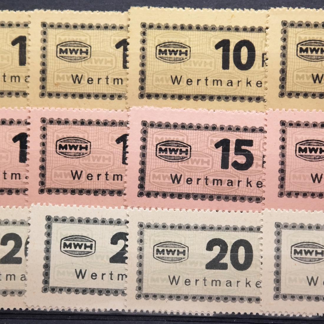 Collection of all seventeen (17) different values of the Munitionsfabrik Und Waffen Hollschein (MWH) chits used at Flossenberg concentration camp, including the elusive 5RM (not known by Carl Siemsen), multiples of all values (except the 5RM) with shades, sound and VF-XF. (Accompanied by correspondence and cover from Carl Siemsen)