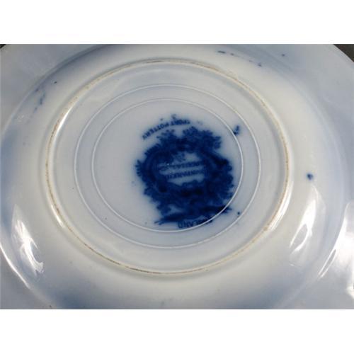 PORCELAIN: A flow blue Burgess & Leigh ''Non Pareil'' shallow soup bowl, 8 1/2'', hallmarked on underside, intricate floral and scenic decoration, hallmarked on underside, slight wear to interior rim, circa late 1800's-early 1900's.