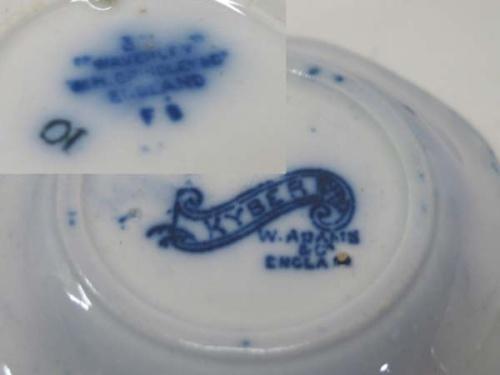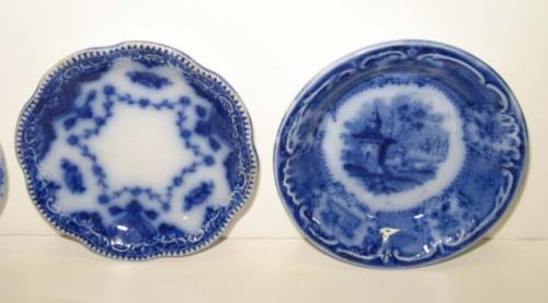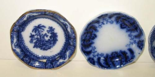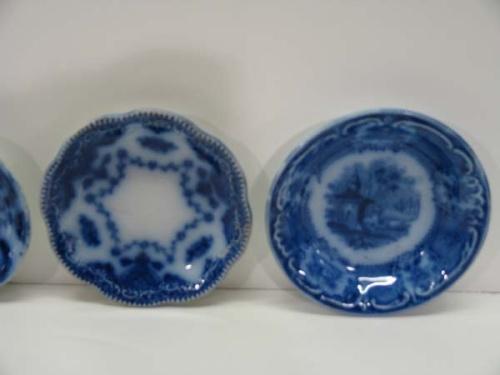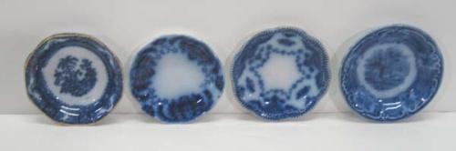 COLLECTION OF FOUR FLOW BLUE BUTTER PATS. Consists of one William Adams butter pat with gilt decorated rim. Shows loss to gilt and marked on reverse “Kyber-W. Adams & Co.-England”. Also consists of one Grindley butter pat. Marked on reverse “Waverly-W.H. Grindley & Co.-England”. Also consists of two odd flow blue butter pats that are unmarked. All show signs of crazing. 3.25” Dia.