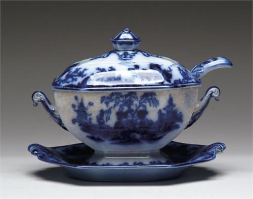 FLOW BLUE COVERED SAUCE TUREEN WITH LINER AND LADLE. Mismatched as follows: The cover and ladle in flower pattern, the tureen in Scinde pattern (stains) and an unmarked underliner with Oriental motif having roughness at one handle. SIZE: Total is 6-1/2in. x 8-1/2in. l x 6in. w. CONDITION: As noted above otherwise good. 9-25817