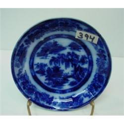 Flow blue handleless cup & saucer, "Manillla" pattern. Cup is 2 7/8" w/rim repair and chunk missing from foot. Saucer is 5 5/8" with impressed "stone ware/PW & Co." and ink stamp marks. AS IS