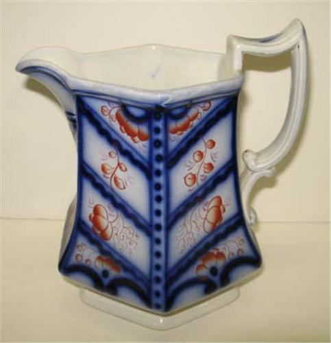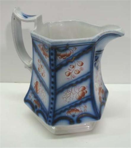 FLOW BLUE PITCHER. Hand painted floral and gilt decorated. Shows some loss to gilt. Numbered by artist at bottom. Shows signs of crazing. 6.75” H