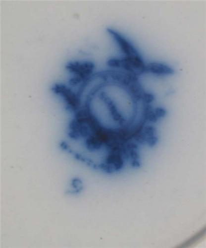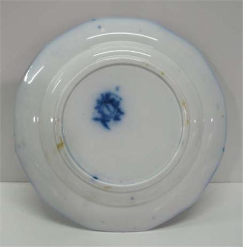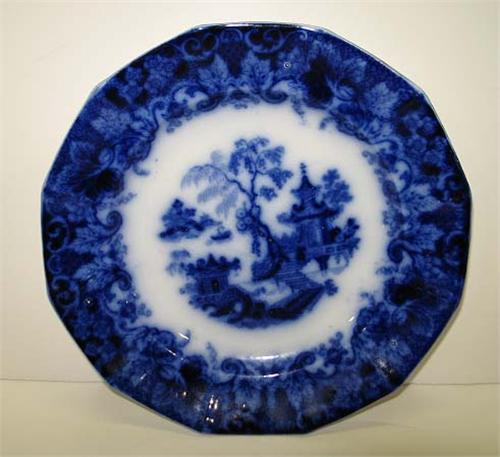 FLOW BLUE DESSERT PLATE. Decorated with Oriental scene. Marked on reverse with Eagle and “T. Walker-Scinde-Ironstone”. 8.5” Dia.