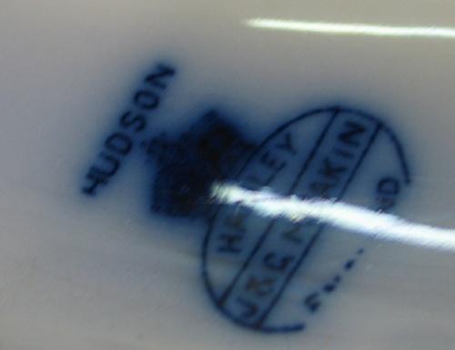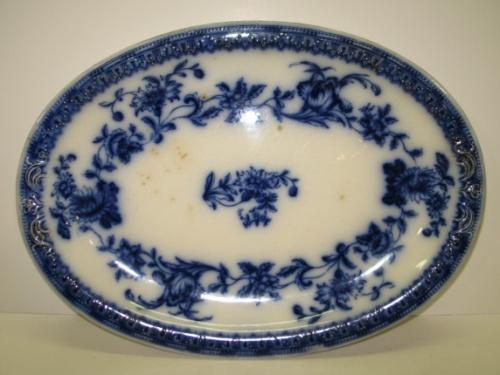 FLOW BLUE SERVING PLATTER. Floral decorated. Shows some signs of crazing. Marked on reverse with crown mark and text reads “Hudson-Hanley-J & C Meaken-England”. 14.5” L