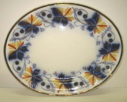 FLOW BLUE PLATTER. Edward Walley (1845-1865). Hand painted floral and gilt decorated. Shows minimal loss to gilt. Impressed mark on bottom. 16” L