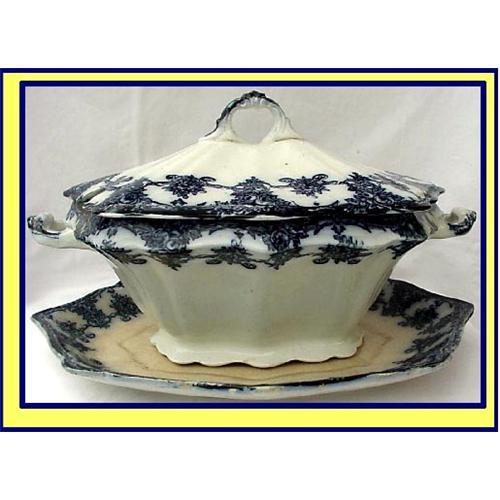 Rare flow blue soup tureen with matching deep undertray. H&K PALMERSTONE. Made in England, 19th century. Measurements: tray is 14 inches long X a little over 10 1/4 wide. Tureen is 14 inches from handle to handle, 9inches accross and 8inches high. Beautiful pattern of roses and blossoms in deep dark blue. Frilly shaped base of tureen is echoed by the well of the undertray and the larger frill of the upper rim and lid are echoed by the curves of the tray rim. Moulded handles and finial. Slightly folded form of tureen. Both tureen and undertray are marked in blue underglaze H&K within a round tube and PALMERSTONE inside the circle formed by the tube. Also underglaze letter F on both shows that they are a matching set. The condition of both pieces is great. The tureen is in excellent condition with absolutely negligible marks hidden on the upper inside corner. The undertray has no damage but is quite badly crazed in the center. The craze marks would likely fade in a bleach bath.