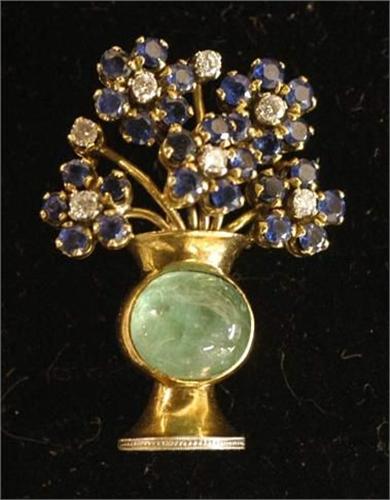FLOWER POT PIN, 18k gold with sapphires and diamonds, 33mm long,PACKING AND SHIPPING BY FAIRFIELD AUCTION WITHIN CONTINENTAL USA (excluding insurance) $20- we will discount for combined shipping on multiple lots,