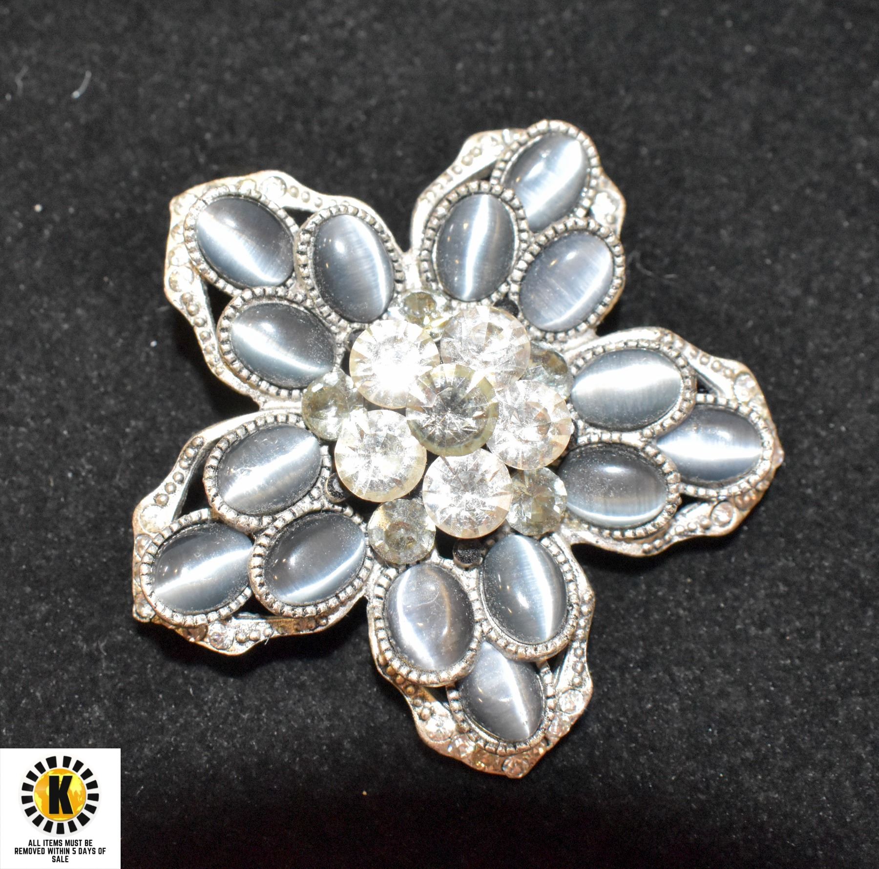 FLOWER SHAPED CATS EYE STONES AND CRYSTAL BROOCH