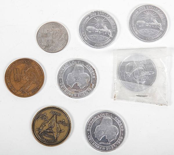 Flown Manned Flight Awareness Medallions. Lot of 8 including Apollo 8 (2x), Apollo 11, ASTP (2x) plus STS 1, and a medallion commemorating the "Unity Node" flown on STS 88. Also included is a National Space Club medallion which includes "material from Apollo 8, 11, Skylab, ASTP and from an early rocket built and flown by Robert H. Goddard." These were generally distributed to contract employees as a "Thank You" for the work they did to make the flight a success. An attractive lot with some minor dings and rubs. Ex. the Astronaut Donald K. "Deke" Estate Collection.